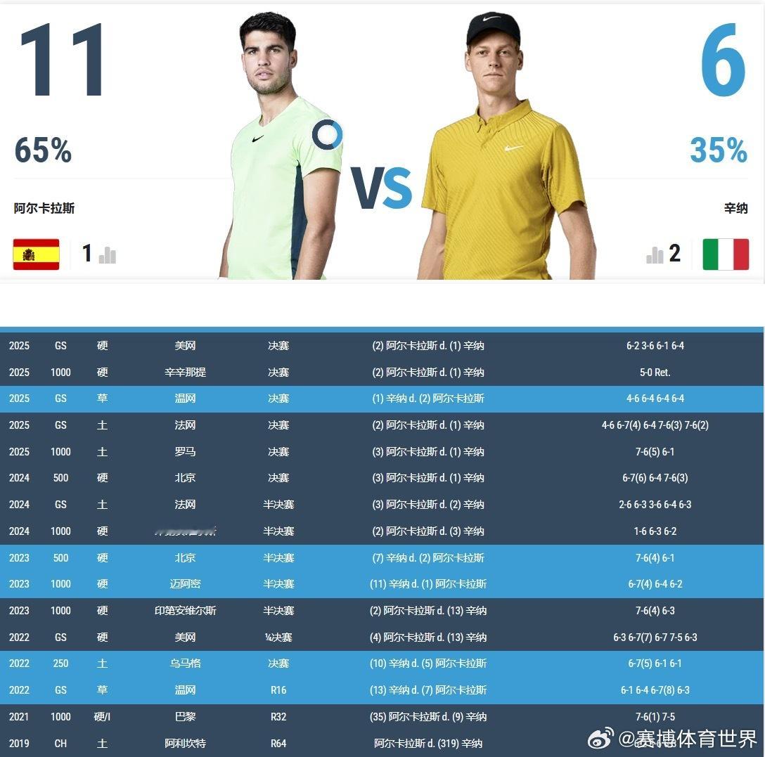 蒙特卡洛大师赛阿尔卡拉斯vs辛纳阿尔卡拉斯辛纳赛季首次交手 ATP1000蒙特卡洛大师赛决赛对阵出炉,世一世二本赛季首次会师决赛,将上演第18次辛卡争锋!阿卡闯进本赛季第一个大师赛决赛,而辛纳继印第安维尔斯和迈阿密之后,连续第三个大师赛晋级决赛。🇪🇸阿尔卡拉斯 vs 🇮🇹辛纳 交手记录👇🏻总交手记录:11-6决赛交手记录:5-3红土交手记录:4-1🇪🇸阿尔卡拉斯晋级之路:R32:6-1 6-3胜🇦🇷巴埃斯R16:6-1 4-6 6-3胜🇦🇷埃切维里1/4决赛:6-3 6-0胜🇰🇿布勃利克半决赛:6-4 6-4胜🇲🇨瓦舍罗🇮🇹辛纳晋级之路:R32:6-3 6-0胜🇫🇷安贝儿R16:6-1 6-7(3) 6-3胜🇨🇿马哈奇1/4决赛:6-3 6-4胜🇨🇦阿里亚西姆半决赛:6-1 6-4胜🇩🇪兹维列夫决赛将于今日北京时间21点进行,期待!