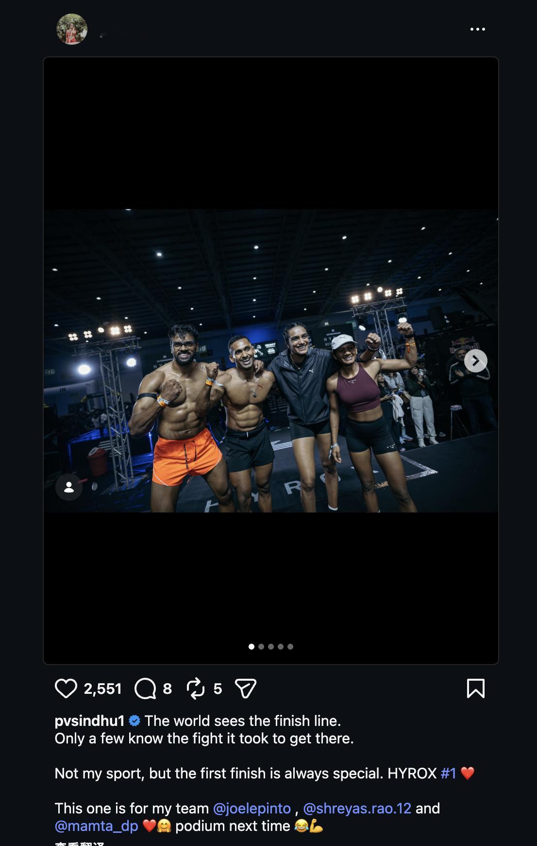 辛杜参加HYROX室内体能赛:世界只看到了终点线,只有少数人知道为了到达那里所付出的艰辛。