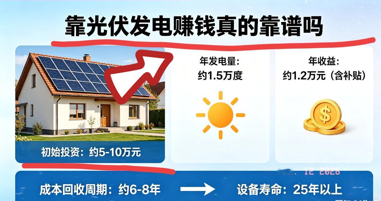 一般来说,安装需要一次性投入几万到十几万,回本周期多在6–10年,之后十几年基本是纯收益。只要选正规品牌、签清楚合同、走正规并网流程,长期来看比较稳定。