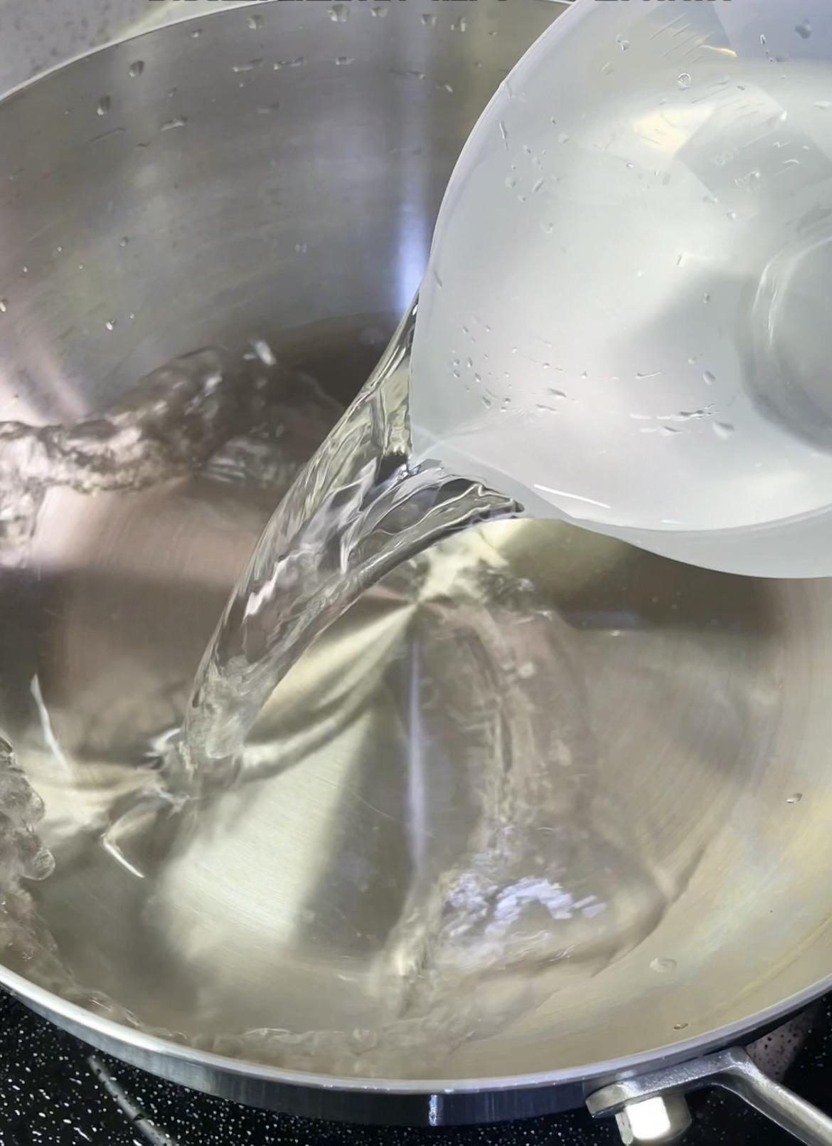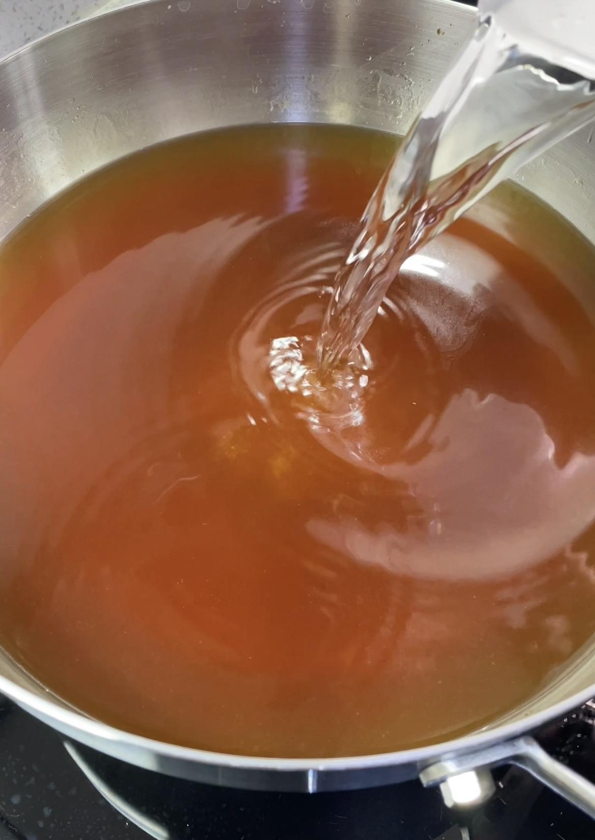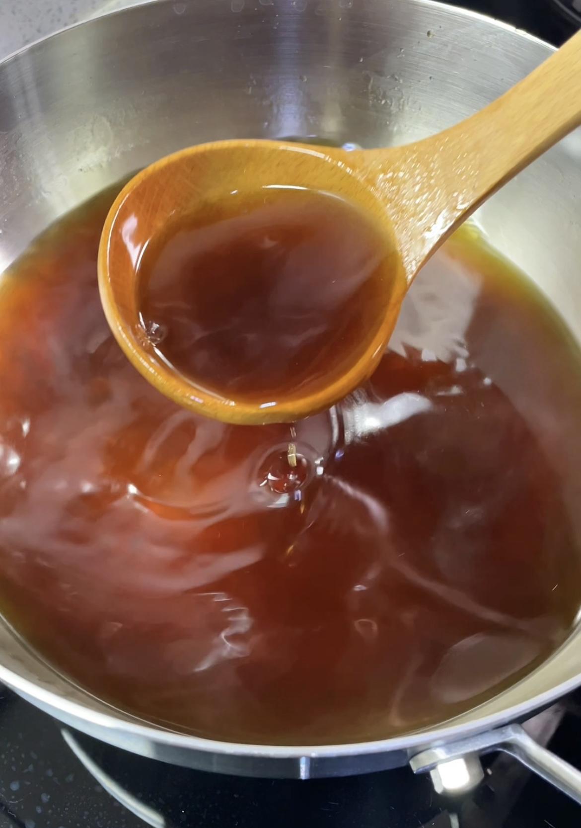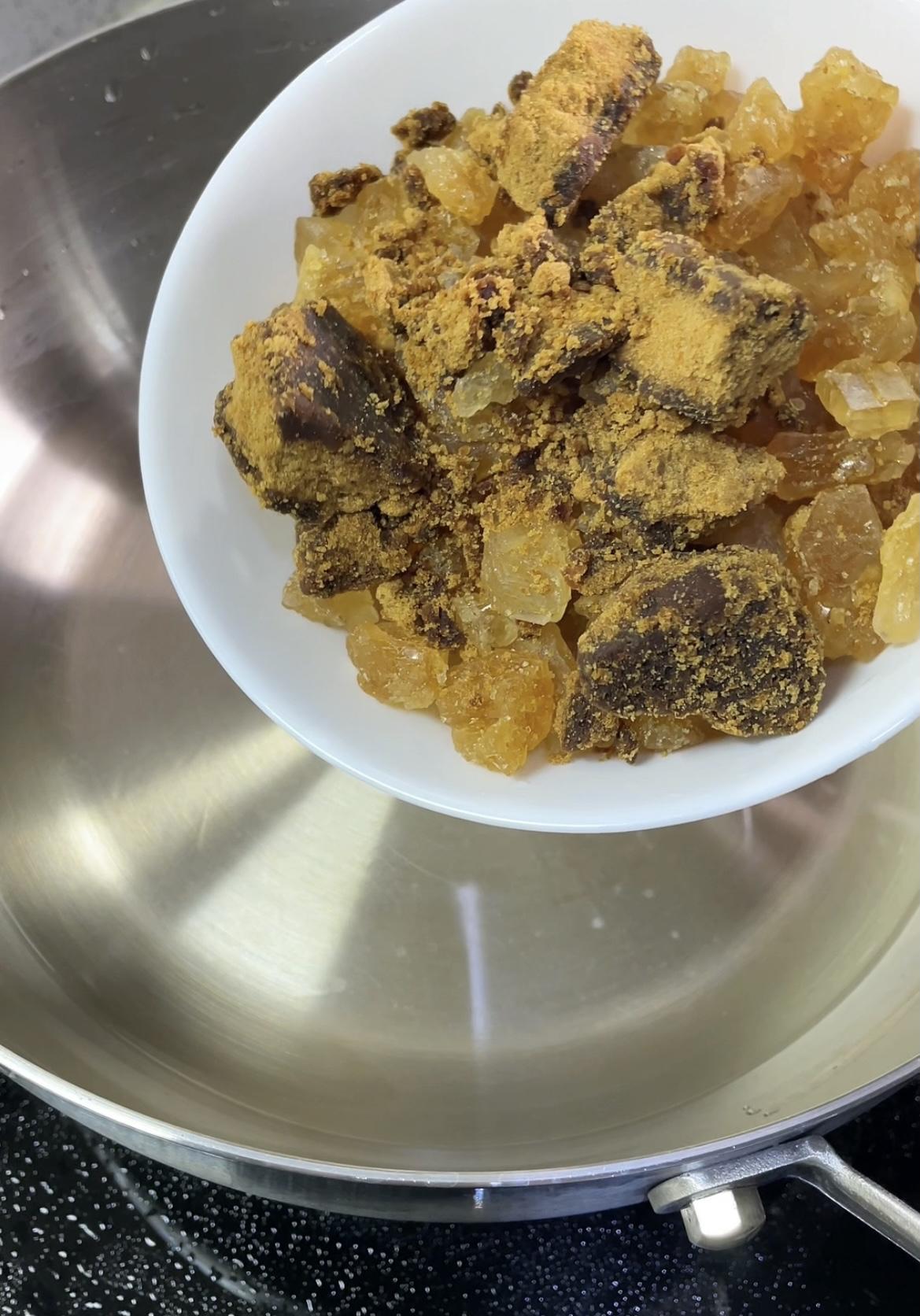 六、用不锈钢锅熬汁(别用铁锅!)锅要干净无油,2斤大蒜,加清水520毫升、黄冰糖300克、红糖60克、(用黄冰糖加红糖腌出来的糖蒜口感很柔和)米醋500毫升、(米醋增香)白醋100毫升、(白醋使口感脆)食用盐20克,先加清水搅拌至冰糖融化,再加盐、醋,烧开后关火放凉;