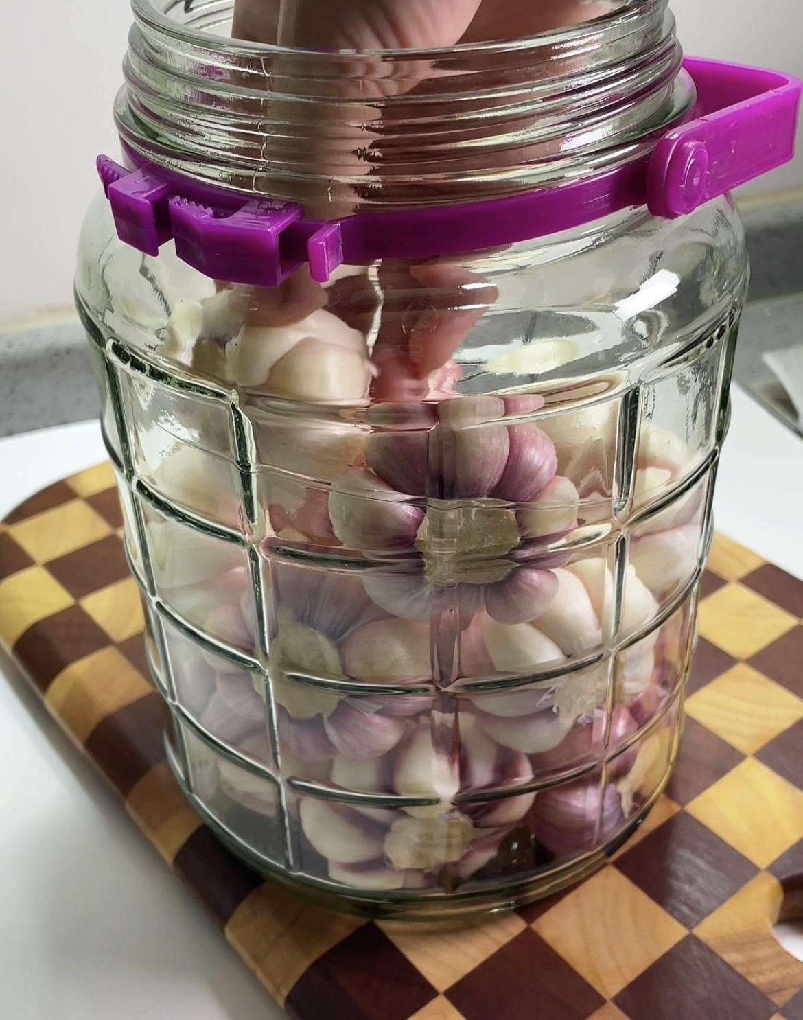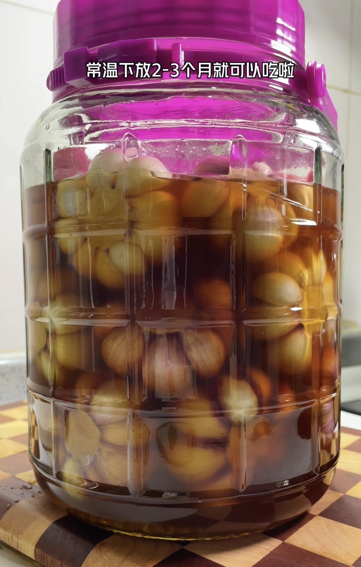 七、玻璃瓶不沾生水不沾油,放入蒜,倒入汁,面上加点白酒封口,盖紧盖子,放置阴凉常温处2-3月后就能吃,(不用放冰箱!)腌制时间越长越入味,越好吃!