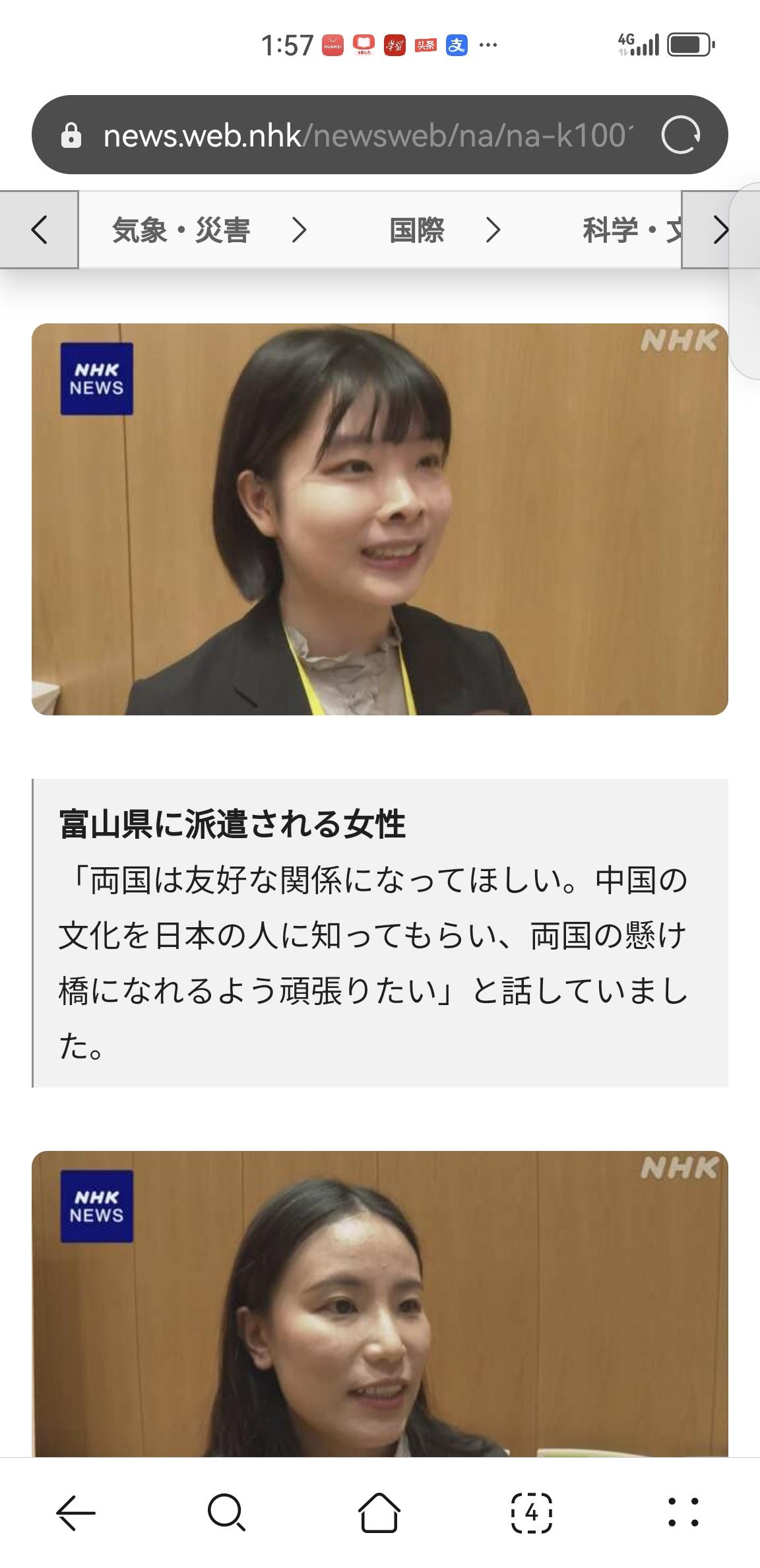 被派遣到富山县的女性,“希望两国关系友好。希望让日本人了解中国文化,努力成为两国之间的桥梁”。