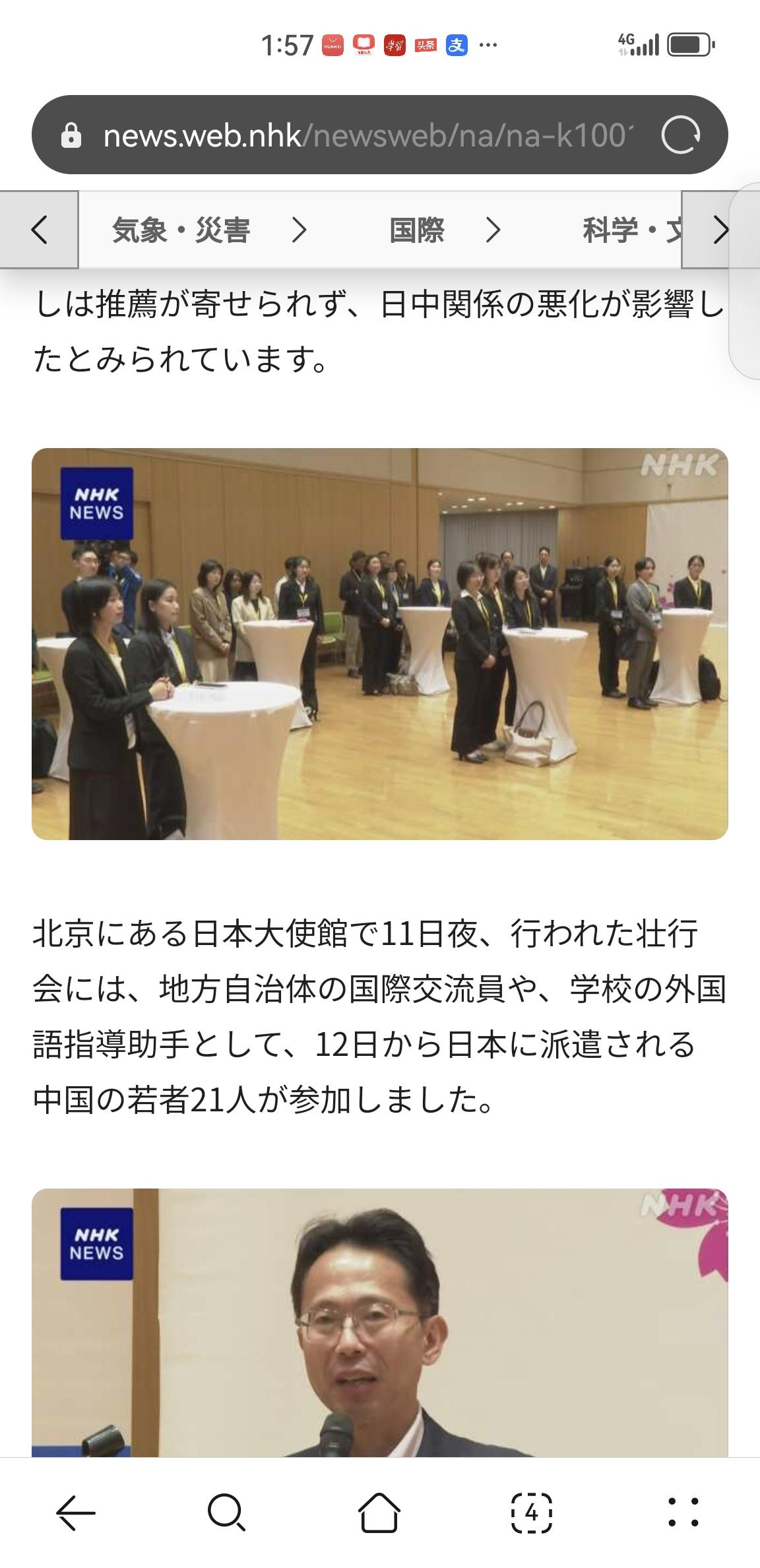 日媒4月12日报道,11日晚,对日本地方自治体从事国际交流等工作的中国年轻人在启程前往日本之前举行了盛大活动。参加者此前都是通过公开招募和中国地方政府推荐的方式选出的,但今年没有收到推荐,中日关系恶化对其产生了影响。