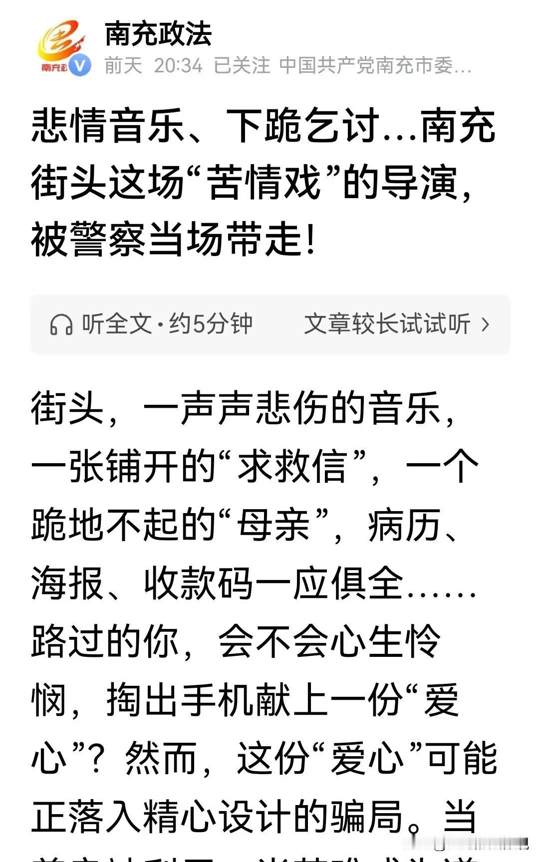 诸位朋友,今儿咱们不聊风花雪月,单说一桩发生在四川南充街头的“魔幻大戏”。这事儿,听着像“苦情剧”,实则是一场让人“三观震碎”的骗局。繁华街头,两女子跪地痛哭,音响里放着《爱的奉献》,海报上写着“救救孩子”,病历、求救信一应俱全。这阵仗,简直是“闻者伤心,听者流泪”。围观群众纷纷解囊,一位热心大哥更是豪爽,当场扫码500元,还贴心地问:“孩子在哪家医院?我去看看缴费单,或许还能帮上忙。”