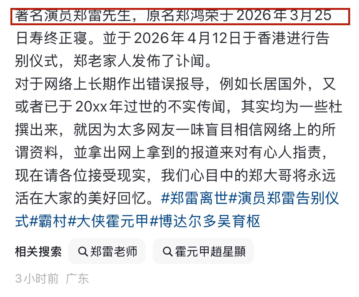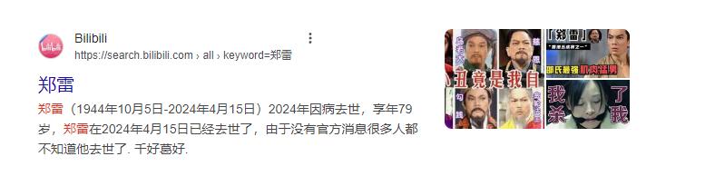 话说回来,如果不是郑雷已经去世,相信的讯息仍然会显示他2024年去世,真的让人感慨现在的某些平台,真的是丝毫不核实啊!