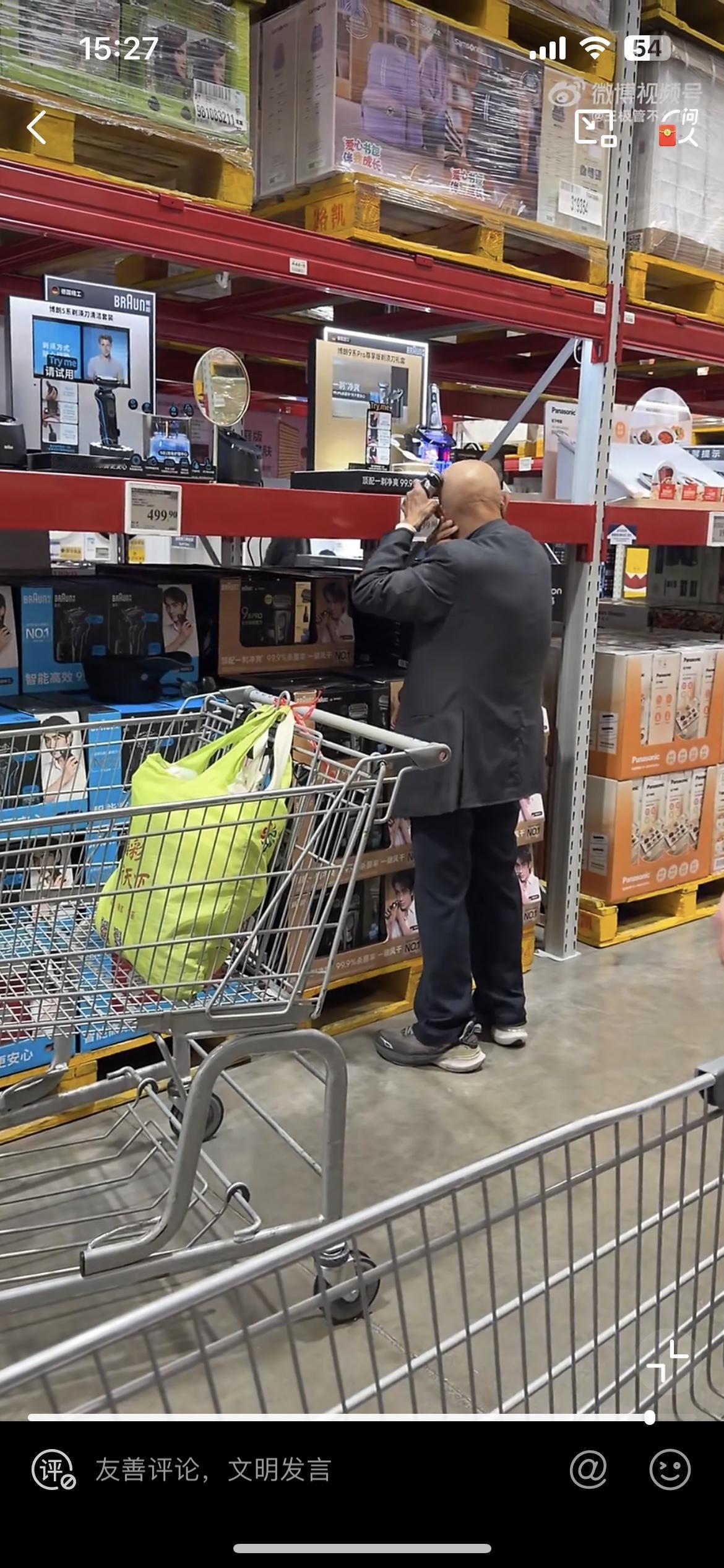 一上海的大爷竟然拿着山姆的剃须刀给自己剃头,这也太不拿人家的商品当回事了吧。4 月11 日在上海一山姆会员店的电器销售区,一个来购物的大爷拿起一台剃须刀,在自己光溜溜的头上剃着毛发,完全是旁若无人,就当自己家里面一样,看起来那么的轻松自然。难道大爷不知道这是售卖的商品,不能直接试用的吗?在他们眼里就没有一点点的规则意识,有便宜就占,出了事情就开始用年龄当挡箭牌,装聋作哑胡搅蛮缠,最后也只能让超市息事宁人不了了之。