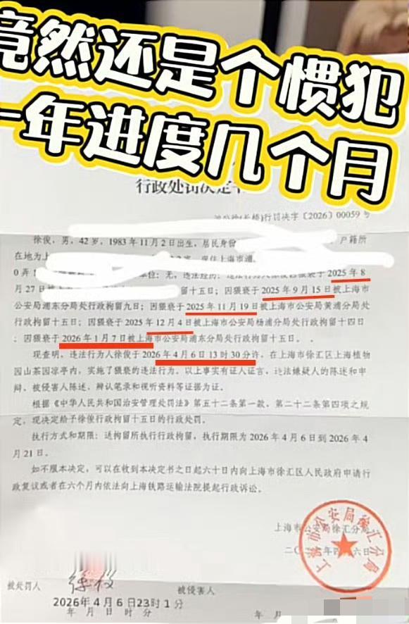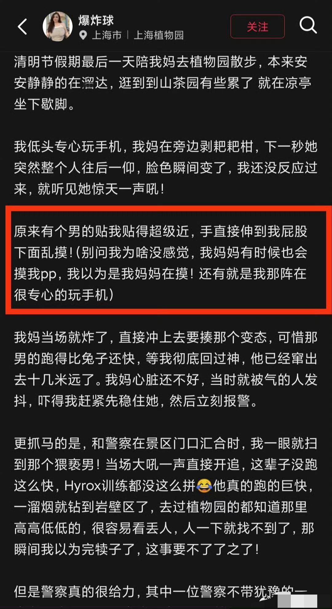 一女子吐槽在上海植物园遭遇一男子猥亵,想不到这个男子是一名惯犯。4月6日,这名女子和她的妈妈在上海植物园游玩,后面在一个凉亭里面休息。女子专心玩手机,坐在旁边的妈妈发现一男子对女儿图谋不轨,她妈妈立马暴起,准备要抓人,男子迅速的溜了。女子报警,好巧不巧在植物园门口看到了该名男子,也许是有点激动,竟然大喝一声。追过去,男子听到后撒腿就跑,不过还是被敏捷的警察给抓了。该名男子在上海各地已经至少 6 次猥亵他人,是一个十足的惯犯。当场被他被抓后不知悔改和羞耻,竟然还嬉皮笑脸。