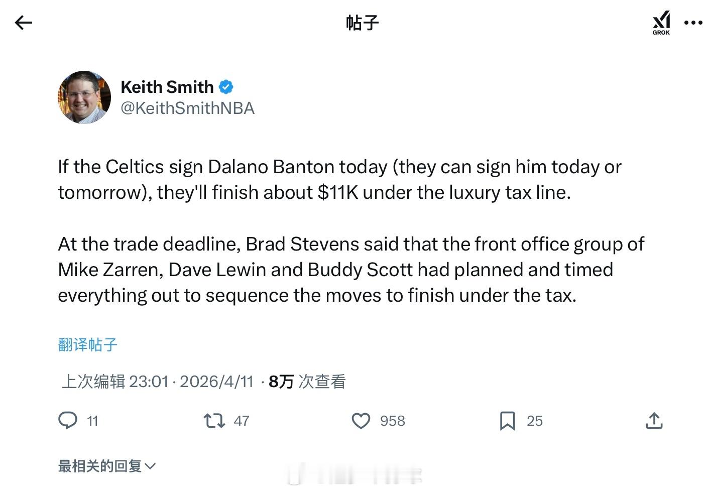 正如Keith Smith预料,签下班顿后,凯尔特人总薪资仅低于奢侈税线9746美元。