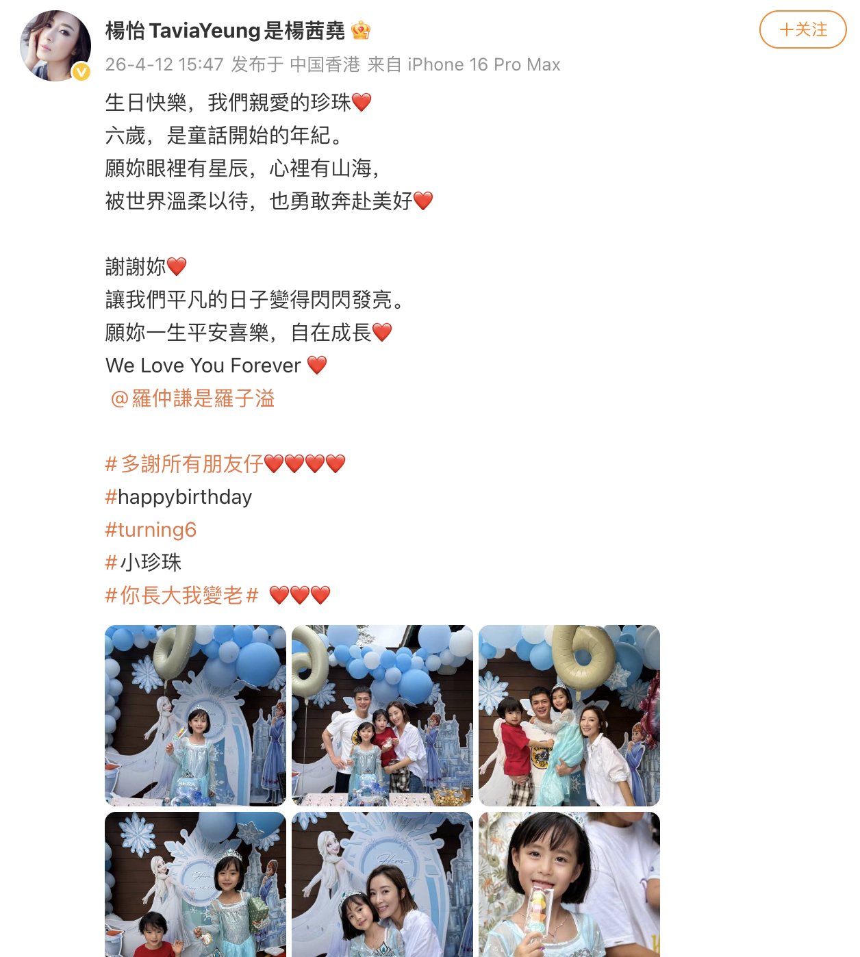 杨怡女儿6岁了杨怡女儿好漂亮 发文为6岁女儿庆祝生日,珍珠好漂亮啊,完美遗传了爸