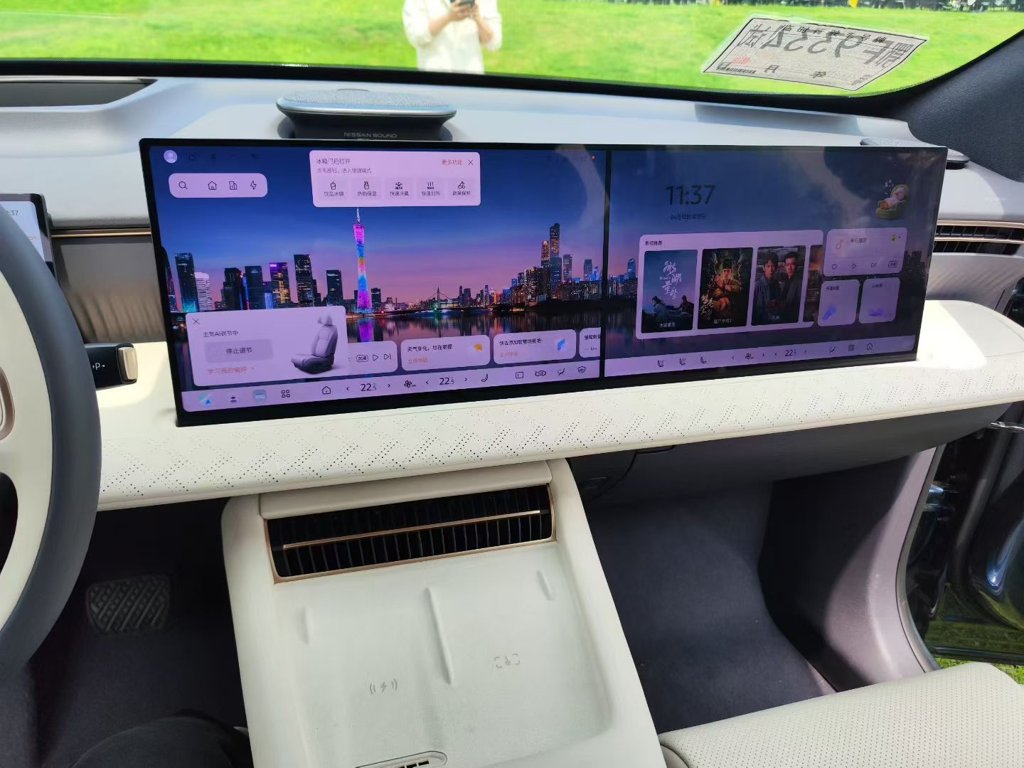 内饰最惊艳的是五屏联动系统!双15.6英寸2.5K中控+副驾屏+10.25英寸仪表+63英寸AR-HUD,屏占比高达89.8%,科技感直接拉满 。搭载高通8295P芯片,配合NISSAN OS 2.0系统,语音识别速度仅400ms,“小尼”AI助手支持四音区拾音,连续对话超丝滑 。