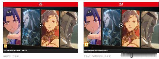其中,《斯普拉遁:涂击队》目前标注为“PEGI 7”评级;而新作《火焰纹章:万缕千丝》则从此前的临时评级更新为“PEGI 12”。
