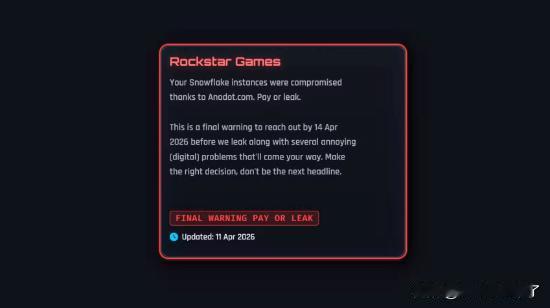 该组织要求4月14日前支付赎金,否则泄露文件。目前仅公司数据遭访问,无证据显示客户密码、支付信息被获取。该组织在暗网发文警告:“RockstarGames,你们的Snowflake实例被Anodot.com攻破,要么付钱要么泄露,4月14日前联系我们,否则将带来数字麻烦。”