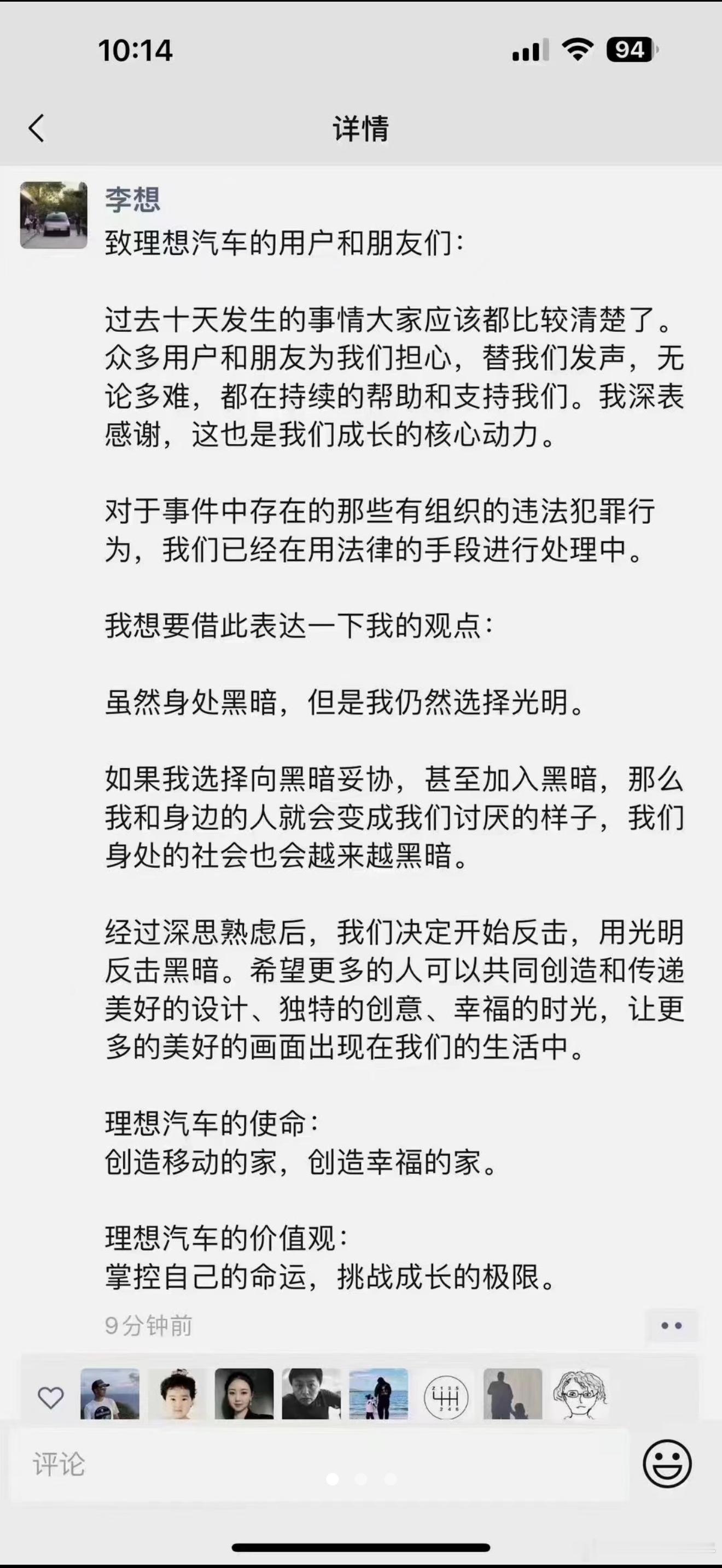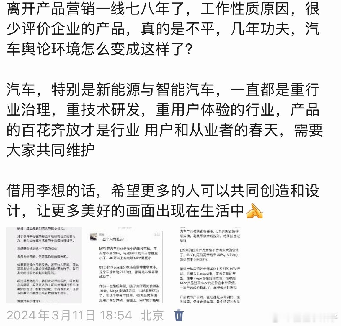 4、关于理想汽车的遭遇,理想应该是这些年被黑的最多的企业之一,从当时MEGA到i8到车主被攻击,还有最初增程被贬低,MEGA事情出来后,我在朋友圈愤愤不平,非常尊敬李想,在创业道路上,李想的很多分享给了非常非常多启发,到现在我都一直学习,同时,作为曾经的产品经理,我也能深深理解项目组开发的不容易,每一个功能都是日夜奋战的结果,我原来睡公司,昨天和理想同学聊天,还一直说,马总刚到北京的时候,直接在公司搞了个洗澡间,而且我认识的很多当年有能力郁郁不得志的朋友,都是在理想展示了自己的能力。现在有些博主说理想,我觉得非常没有必要,不能再被冤枉了。