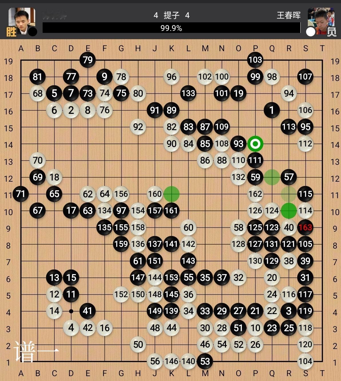 王春晖执白棋对阵陈祈睿,布局阶段的第44手导致形势落后,中盘右边的攻防中白112、114以后再度连续出现失误,胜率瞬间跌至1%左右,之后虽然奋力追赶仍未能挽回败局(见谱一)。