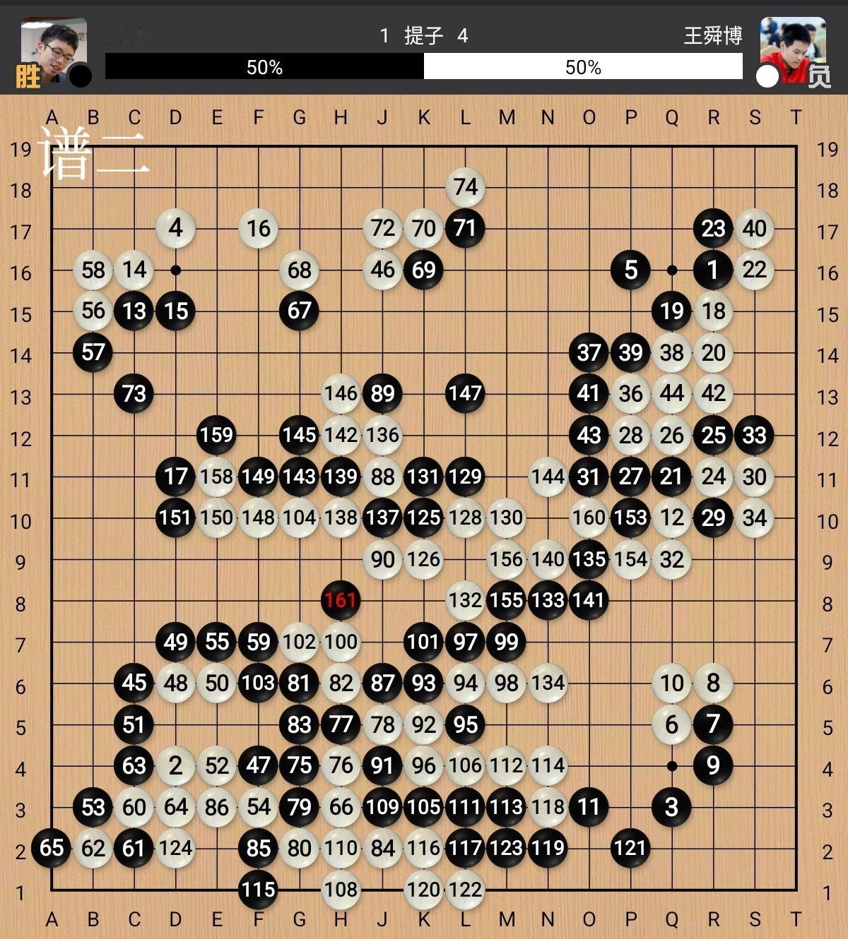 王舜博执白棋对阵台湾第二高人的赖均辅,布局右上角有所吃亏,左上角又过于保守软弱,短短的几十手后白胜率即跌至个位数,早早的呈现败势,拼搏中大龙被屠,中盘认负(见谱二)。