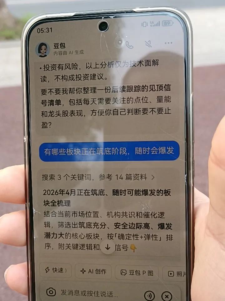 豆包可不可以预测股票的底或顶?这个是一个非常富有创意性的问题,看看豆包如何从容面对这个挑战,让我们看看吧。给豆包一张金融板块的日k图,发这个到底了吗?指令,豆包会给出是否到底的分析。给豆包一张光通信板块的日k图,发这个到顶了吗?指令一,豆包会给出是否到顶的分析。进阶问题,发豆包:有哪些板块正在筑底阶段,随时会爆发的指令,不到几秒豆包会罗列出可能爆发的板块及其分析。