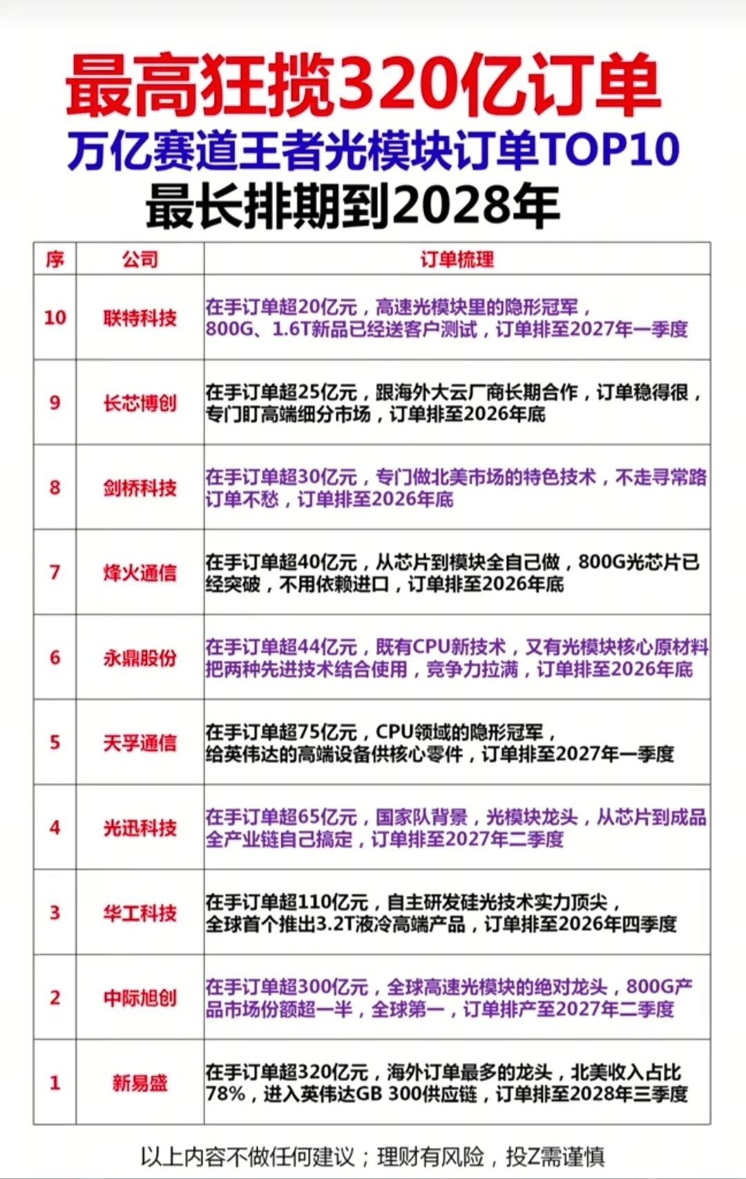 国产存储芯片订单最高狂揽380亿,排期直达2028年底;绿电赛道王者订单超2000亿,最长排期到2030年;锂电池领域龙头手握1500亿订单,排期冲到2030年;创新药企业年报业绩最高暴涨超3000%;光模块赛道龙头订单超320亿,排期至2028年三季度;光通信国家队迎来全球需求缺口,价格同比暴涨418%!