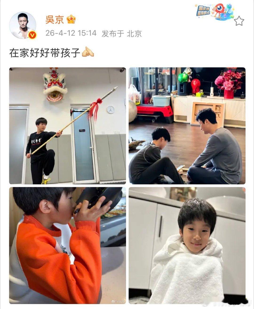吴京真在家带娃了 吴京默默在家带娃。他这后勤工作,堪称一流,用行动为谢楠打气。谁说硬汉不懂温柔,带娃的吴京超有爱~😃倪萍让吴京在家把孩子照顾好