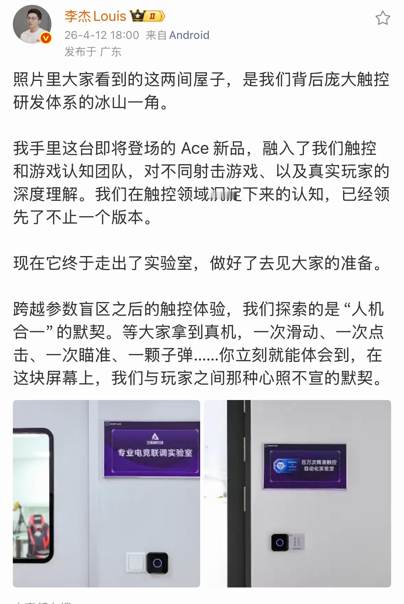 一加全新Ace开始预热了、这次的触控有很大提升、期待“人机合一”“操控合一” 指