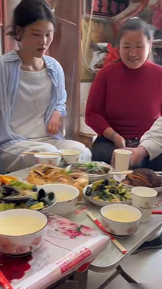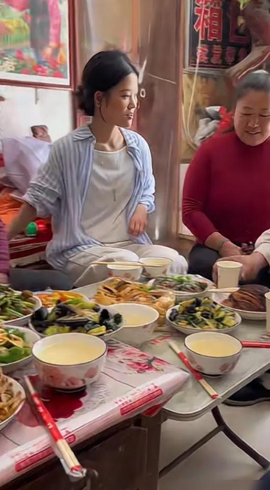 她坐在那儿,背景墙还是结婚照。