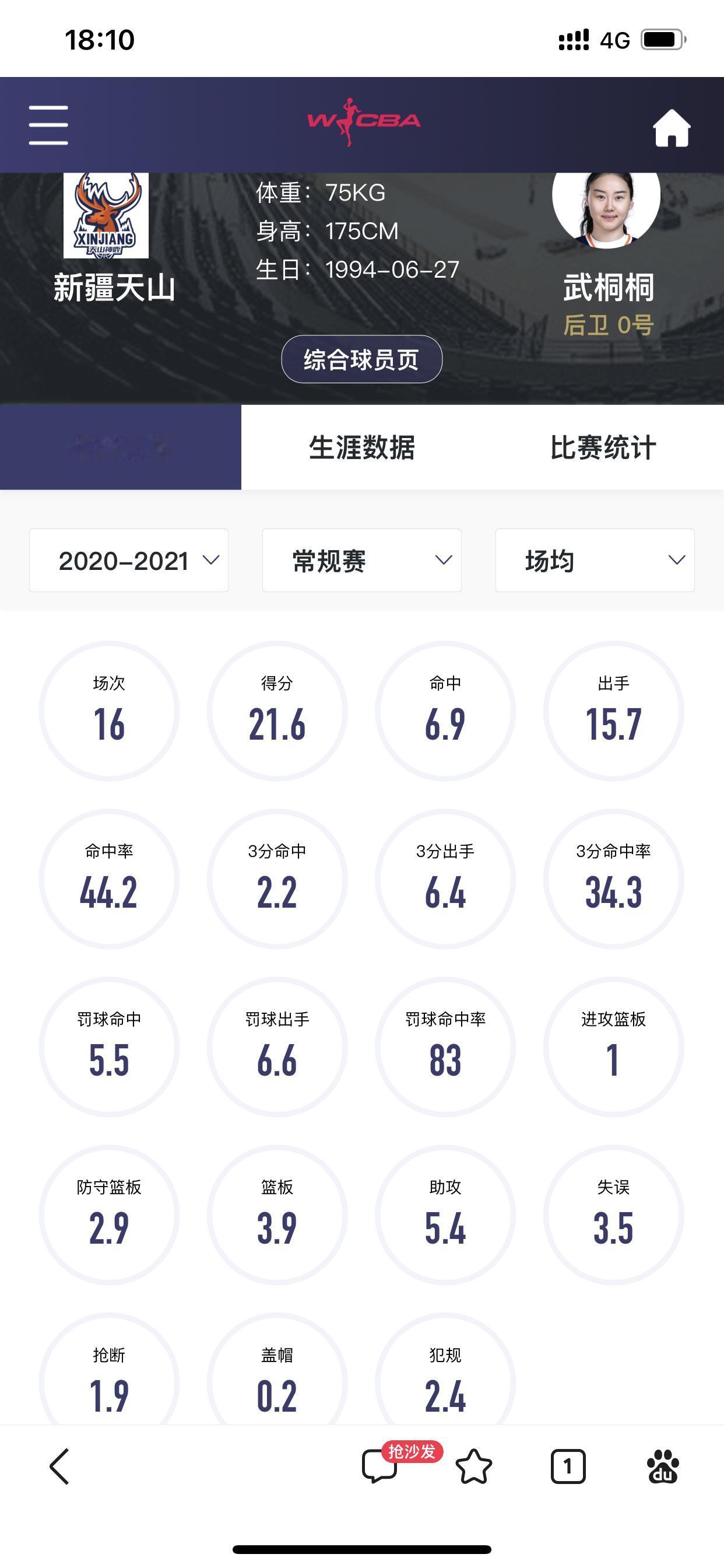 那么她生涯最高是WCBA2020-2021赛季,场均21.6分3.9板4助攻1.9断0.2帽,命中率44.2%,三分球命中率34.3%