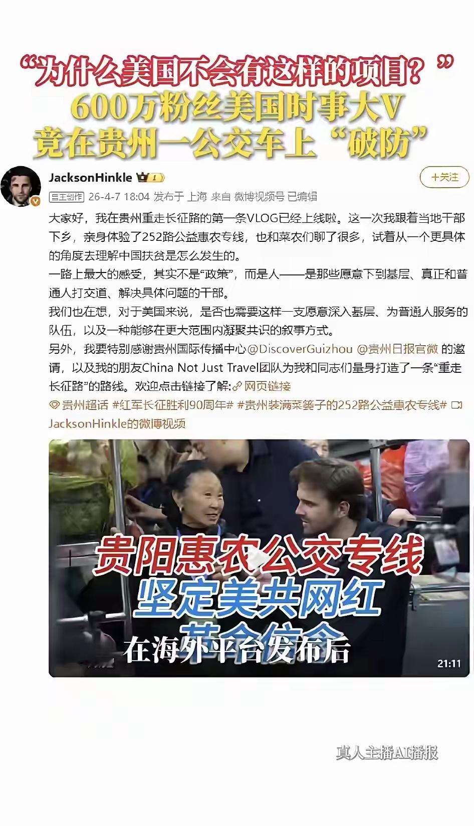 为何美国农村做不到?4月9日,一则来自中国贵阳的视频,在海外社交平台掀起轩然大波。美国共产党发言人、坐拥610万粉丝的顶流时事博主Jackson Hinkle,做出了一件让无数西方媒体意想不到的事——他没有奔赴北上广深拍摄繁华都市,也没有打卡网红景点制造流量,而是在凌晨五点天还未亮的时刻,扛着专业摄像设备,一头扎进了贵阳252路公交车。