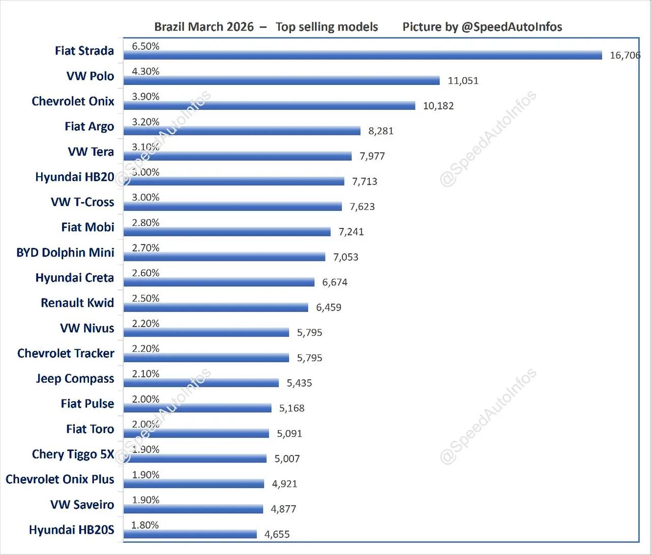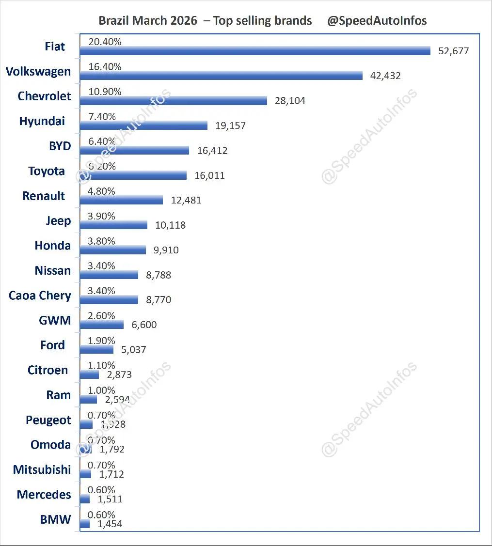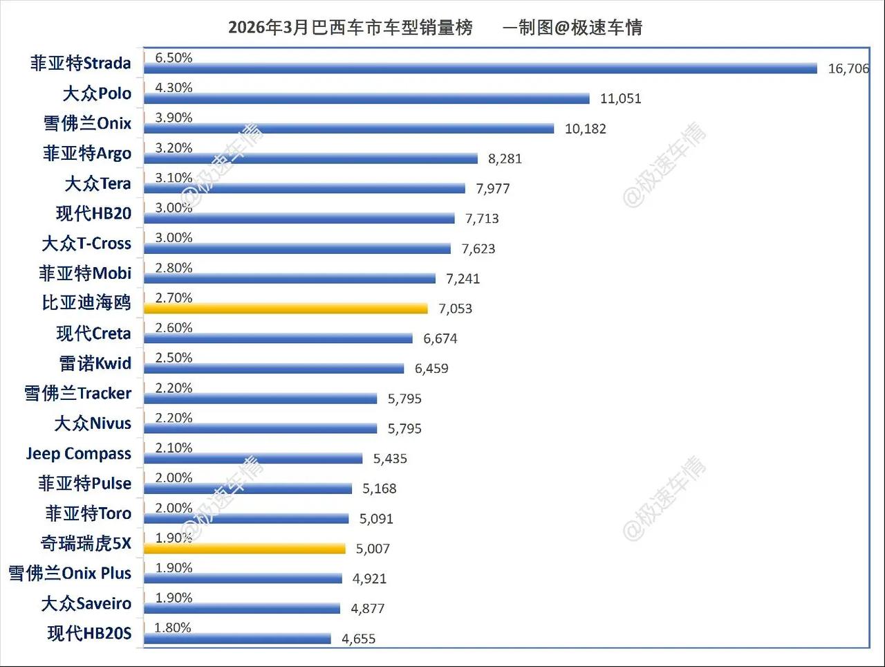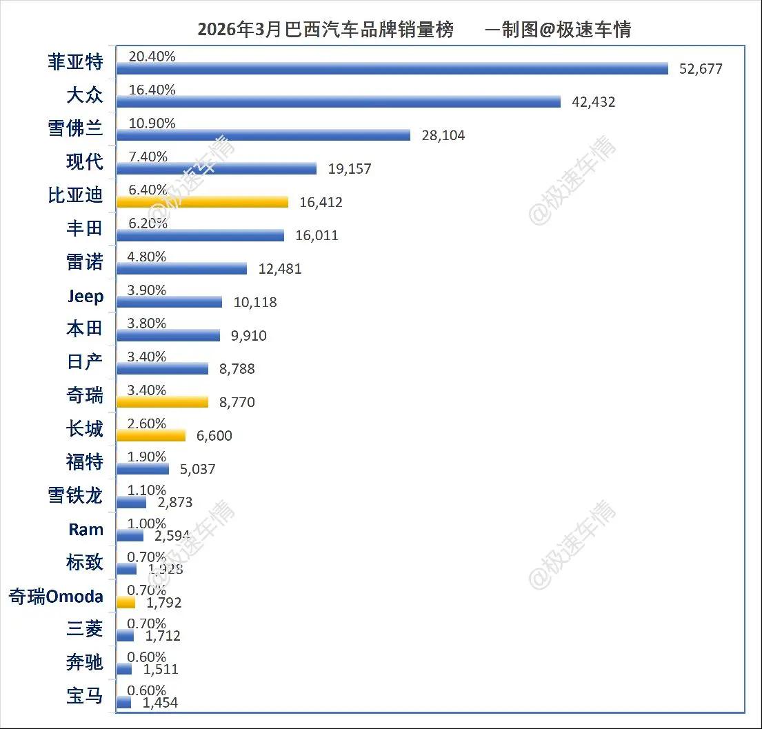 巴西2026年3月汽车销量排行榜。巴西3月,比亚迪大涨103.5%,蝉联第五;奇瑞大涨126.5%;长城暴涨233.2%!极速车情 巴西 比亚迪 奇瑞汽车