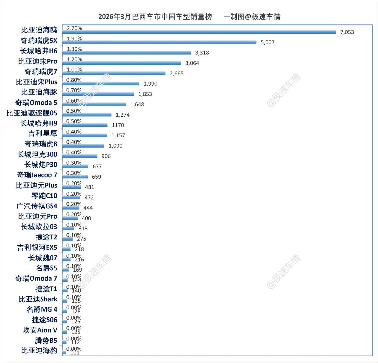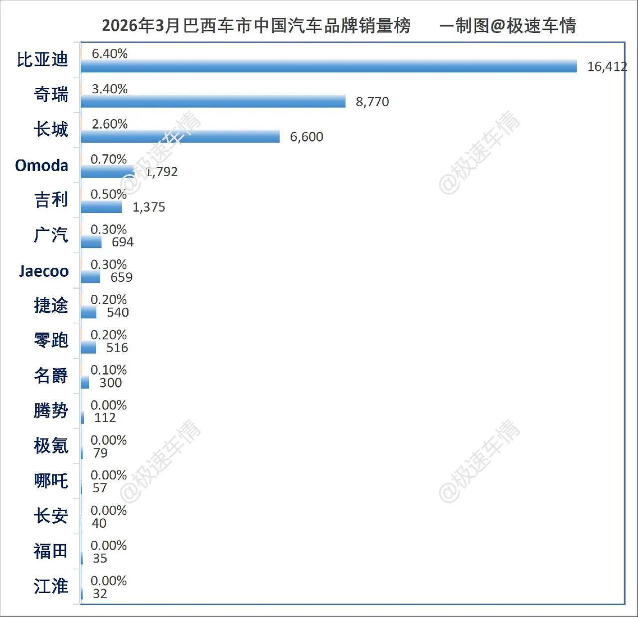 巴西2026年3月汽车销量排行榜。巴西3月,比亚迪大涨103.5%,蝉联第五;奇