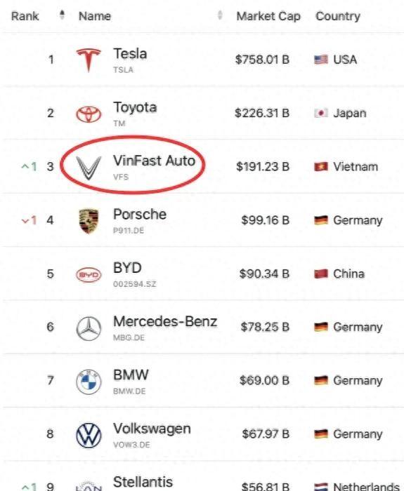 这家公司叫VinFast,老板是越南首富潘日旺。2023年8月在纳斯达克上市,头一天涨了250%,全球车企里市值排第三,仅次于特斯拉和丰田。
