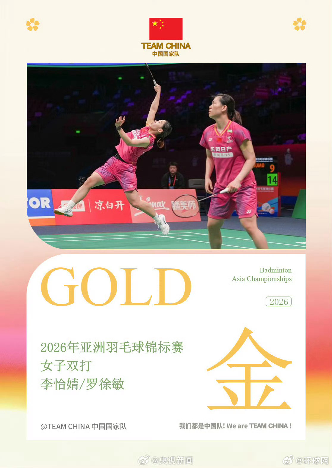 #国羽包揽亚锦赛女双金银#【祝贺!#李怡婧罗徐敏亚锦赛女双金牌#】今天,2026亚洲羽毛球锦标赛女双决赛,两对中国组合上演正面交锋。李怡婧/罗徐敏获得本次比赛的女双冠军,这也是二人首次获得亚锦赛女双冠军。刘圣书/谭宁获得银牌。 (央视)