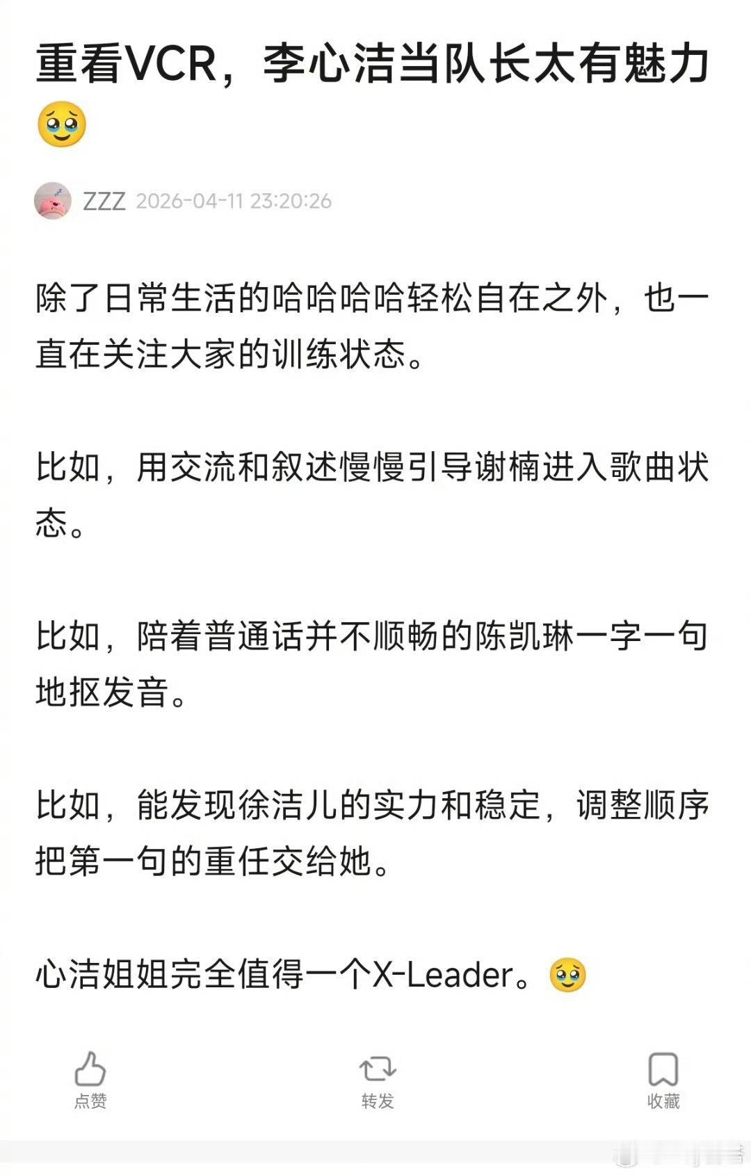 李心洁浪姐当队长太有魅力了谁懂啊,李心洁当队长真的有点东西。不是那种喊口号的,是自己在训练状态里一直泡着,还能顺手帮陈凯琳抠普通话发音。引导每个人把最好的一面留在台上,温柔又靠谱。这队长当得,路人看了都得说声服气~乘风2026