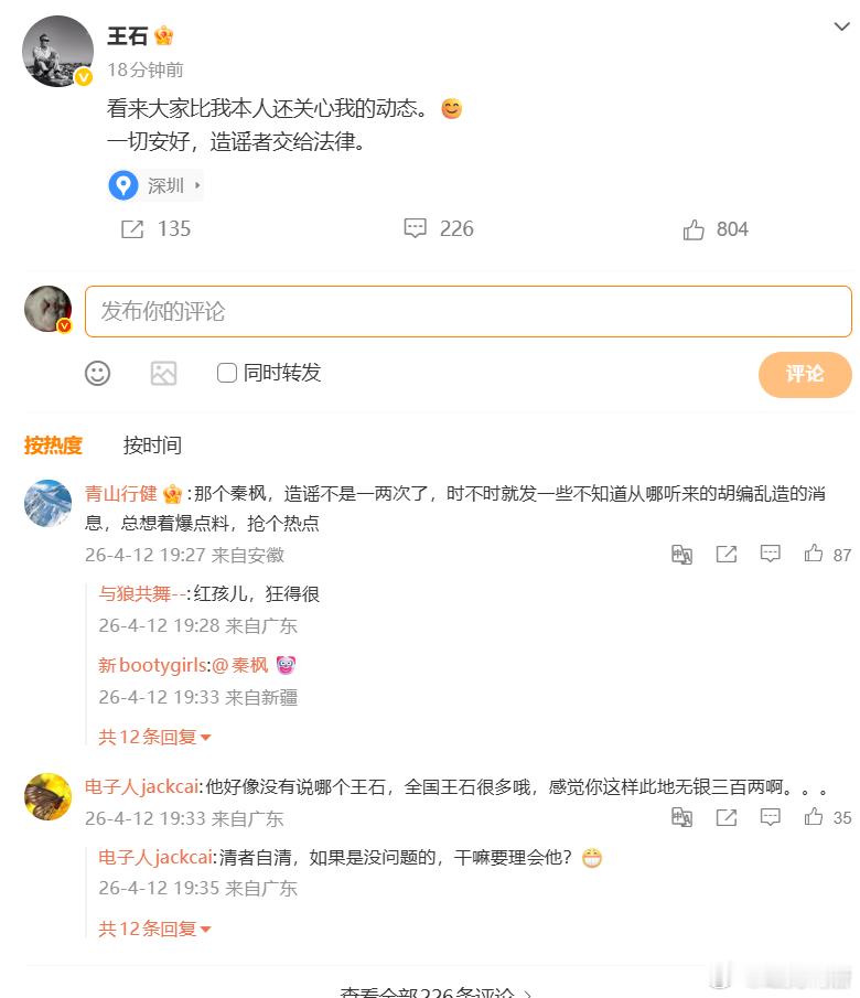 这下喜欢王石的和不喜欢他的,全都无语了,只因造谣的一本正经说:“王石已经