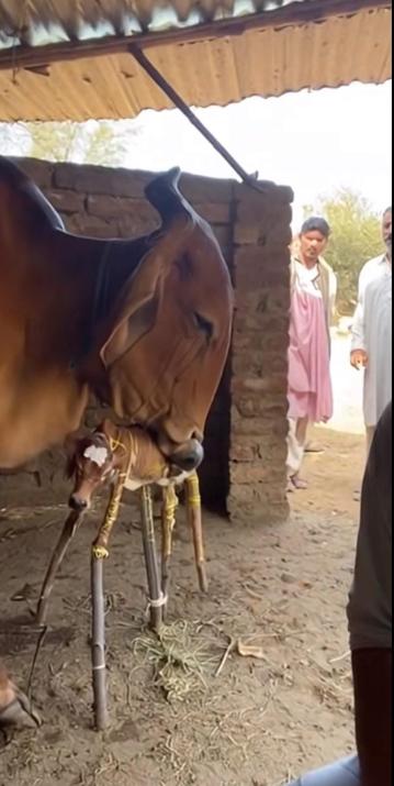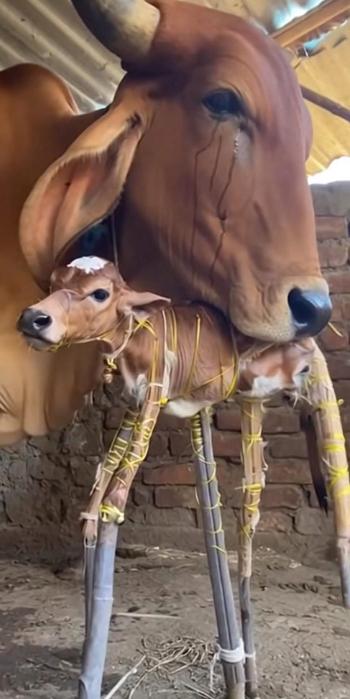 小牛无法站立,几个小时内,情况变得十分危急。就在这时,一位男子挺身而出。他只用绳子和木棍,小心翼翼地将虚弱的小牛扶了起来,不让它死去。