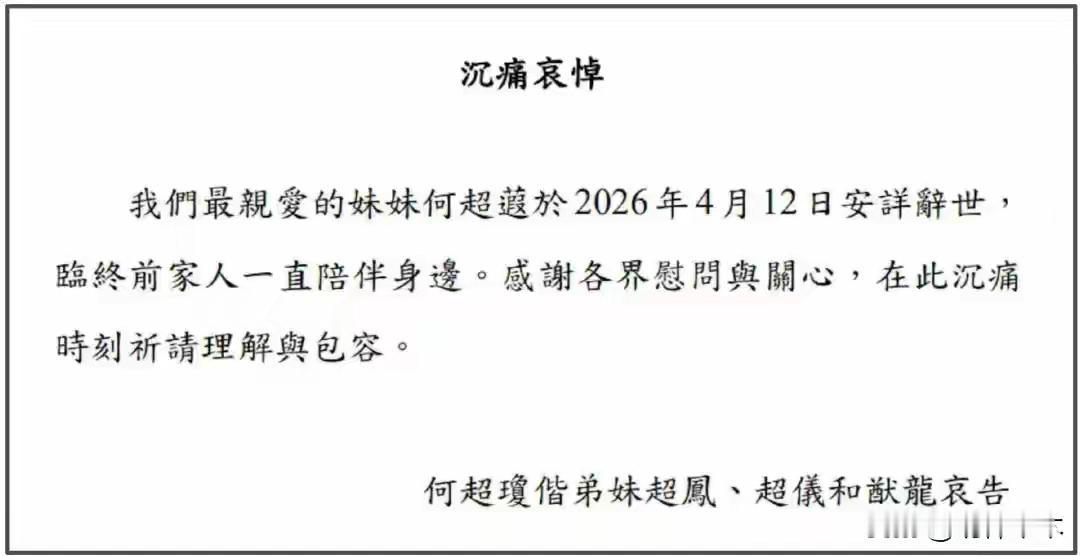 何超琼三妹何超蕸被曝因为乳腺癌困扰多年不治离世,年仅60岁,最后露面显得非常疲惫