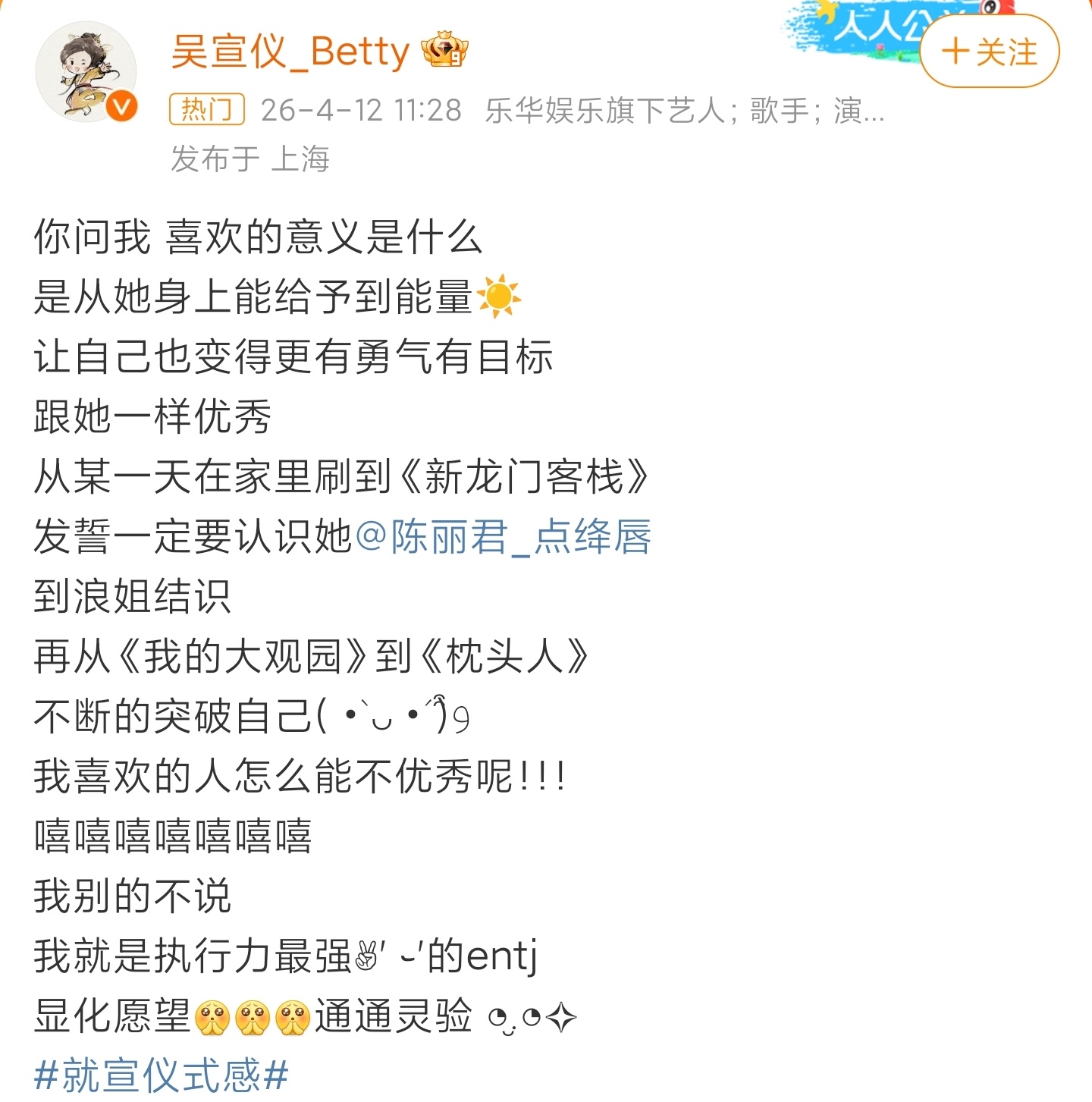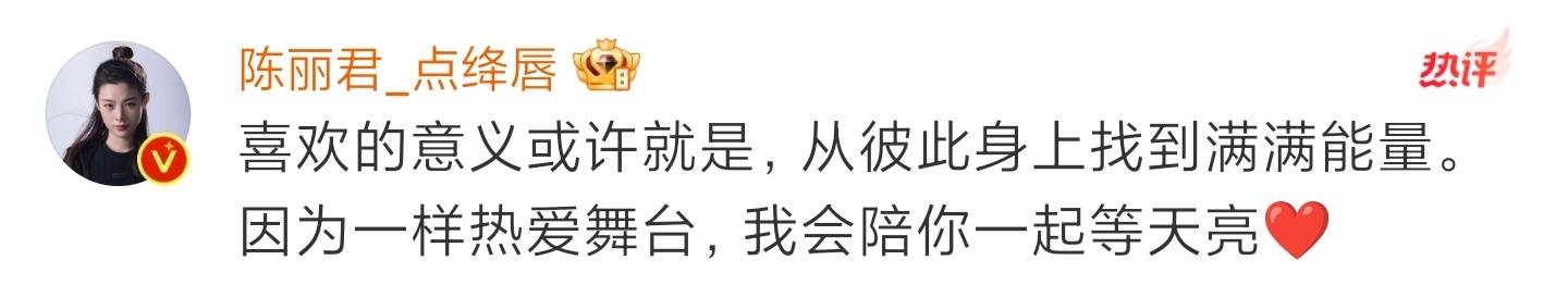 【吴宣仪陈丽君双向奔赴】又被陈丽君温暖到了发文晒和合影,并回忆两人的友谊,陈丽君回复:“喜欢的意义或许就是,从彼此身上找到满满能量。因为一样热爱舞台,我会陪你一起等天亮❤️”