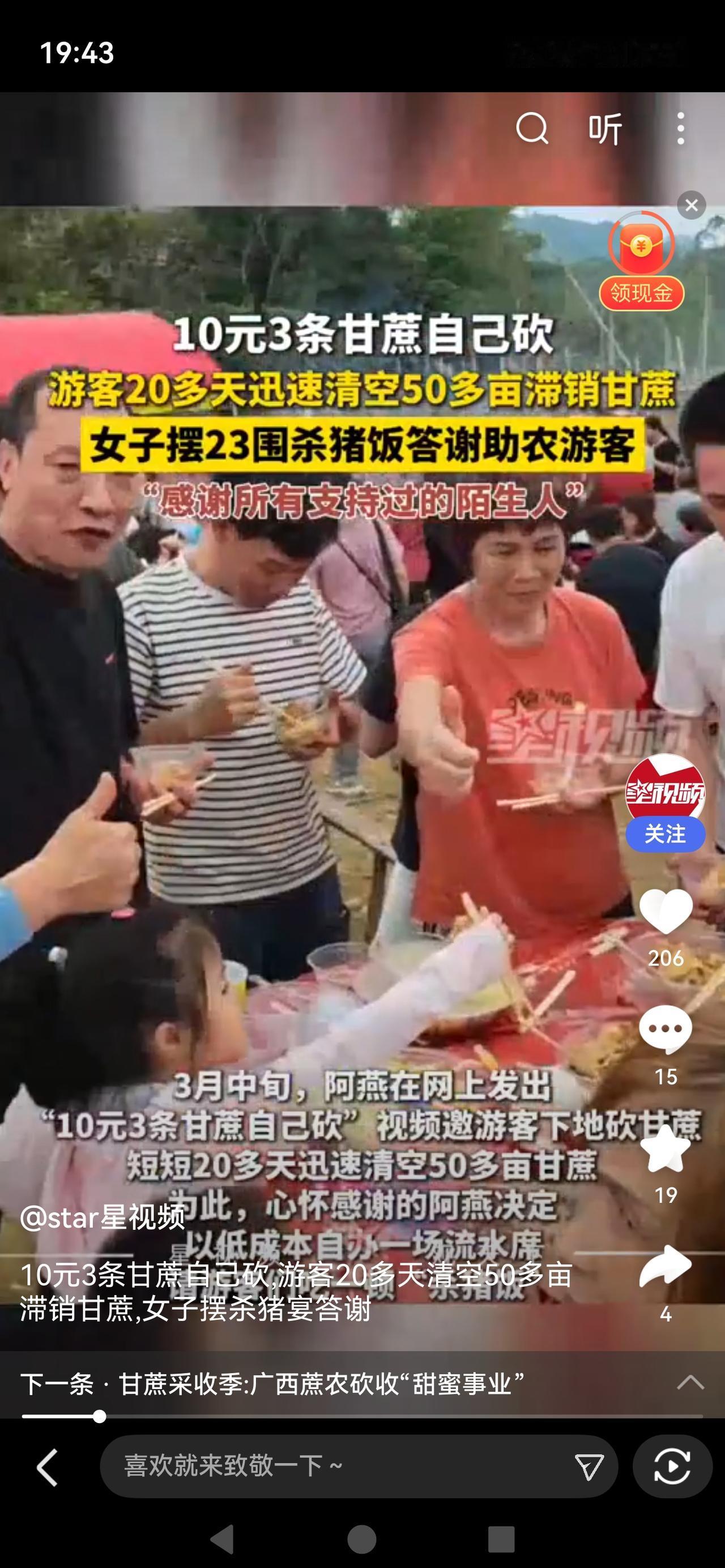情急之下,这位蔗农想出了一个最简单也最大气的办法——“10块钱3条,大家伙儿下地随便砍”!没想到这一招一出,彻底火了!周边市民、游客闻风而来,不光是买甘蔗,更是来帮衬老乡。大家边玩边摘,二十多天就把五十多亩地清得干干净净。