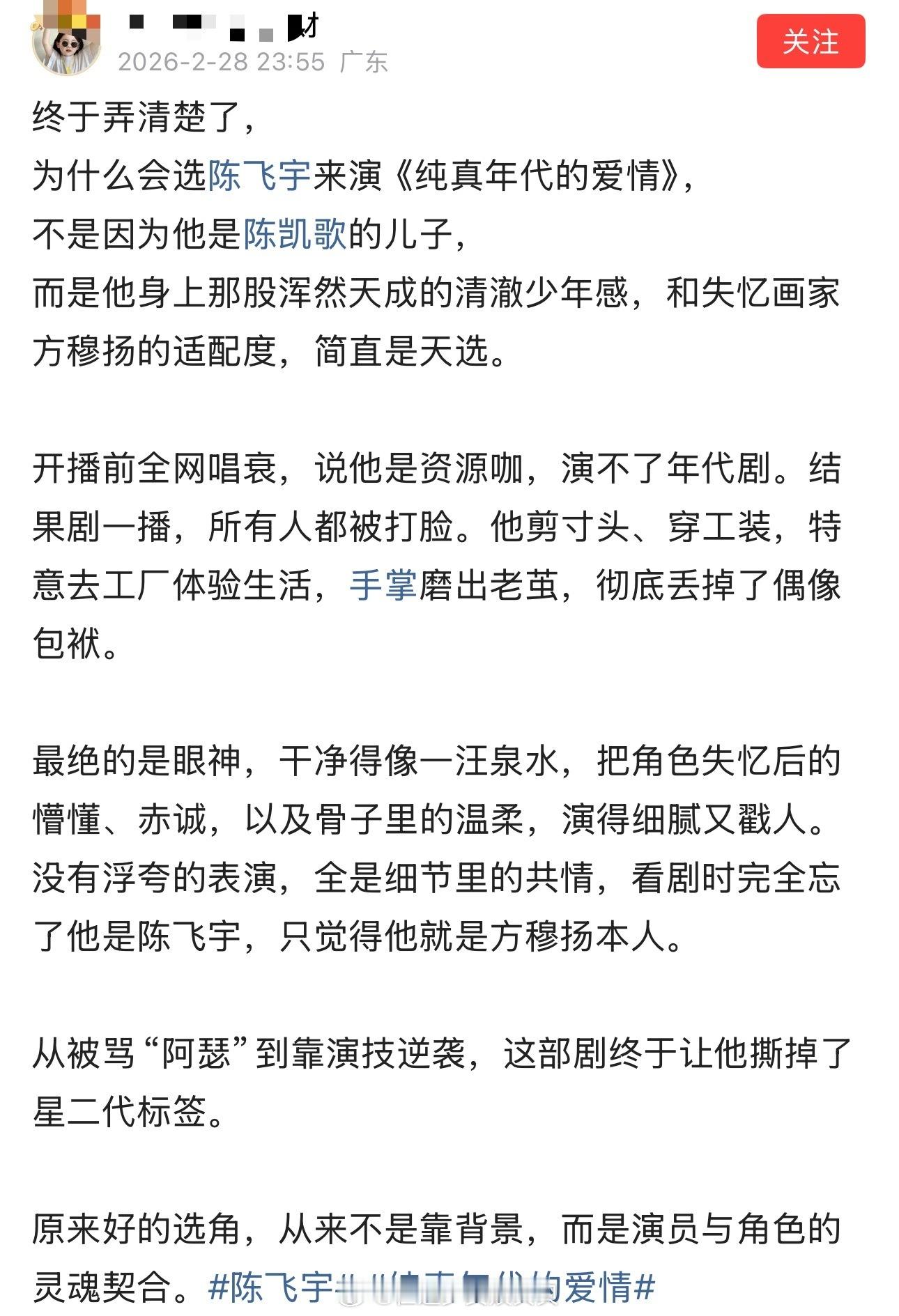 终于弄清楚了,为什么会选陈飞宇来演《纯真年代的爱情》,不是因为他是陈凯歌的儿子