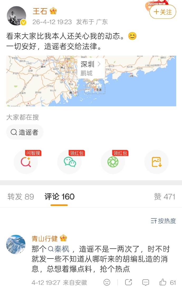 王石否认被抓有意思了,当天爆料当天辟谣,爆料者也不一般,粉丝过千万,做过凤凰卫视