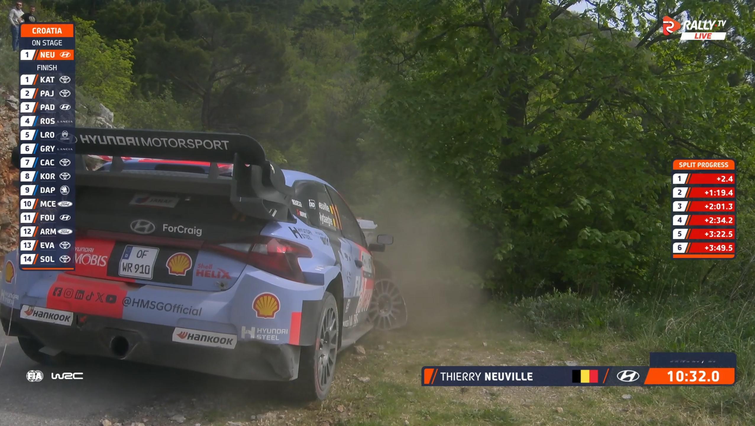 啊?!诺伊维尔在最后一个赛段中撞上了水泥墩并冲出赛道,损伤了赛车!胜田贵元和领航