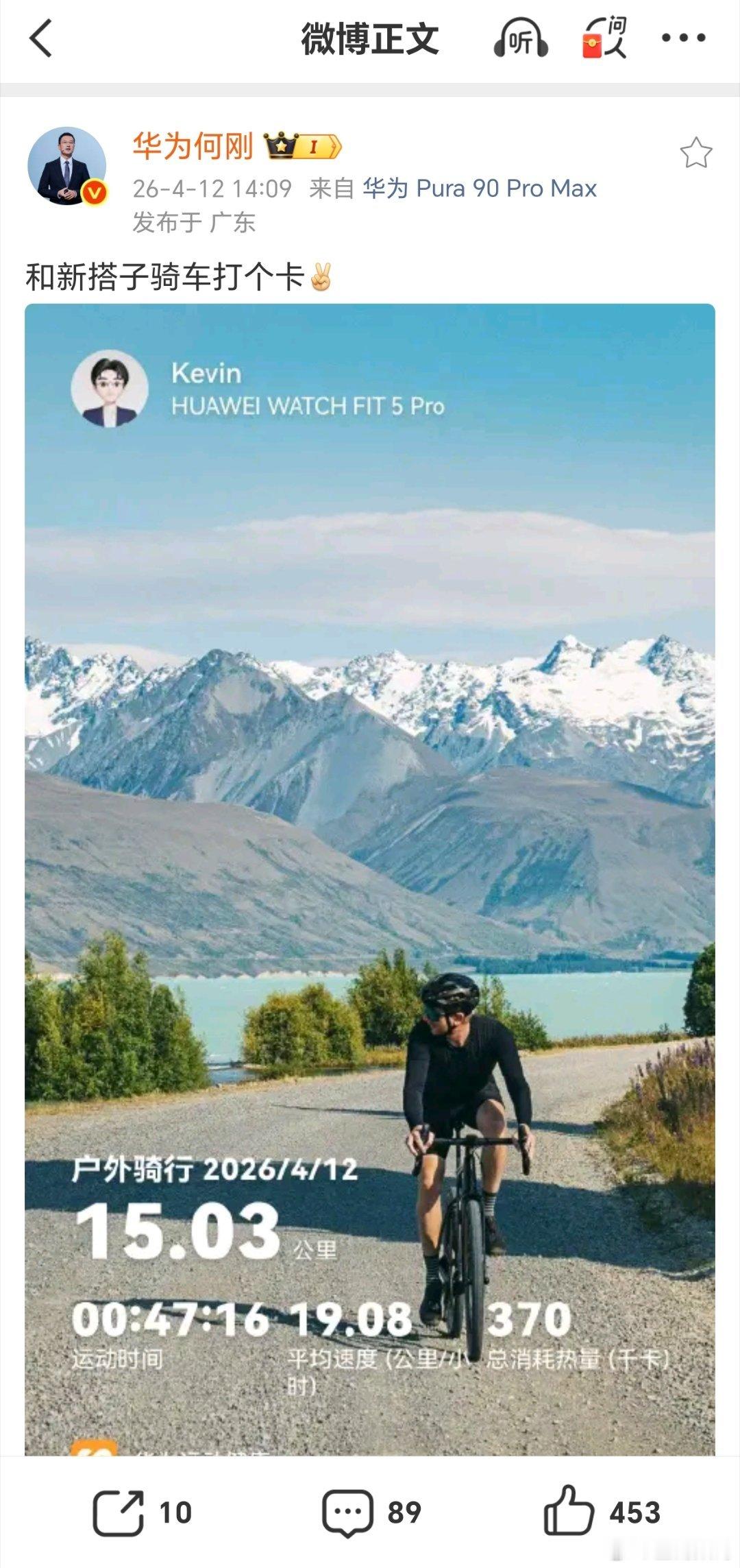 华为终端 BG 首席执行官何刚发布微博:“和新搭子骑车打个卡”,配图中出现 HUAWEI WATCH FIT 5 Pro 的名称,暗示新品即将发布。