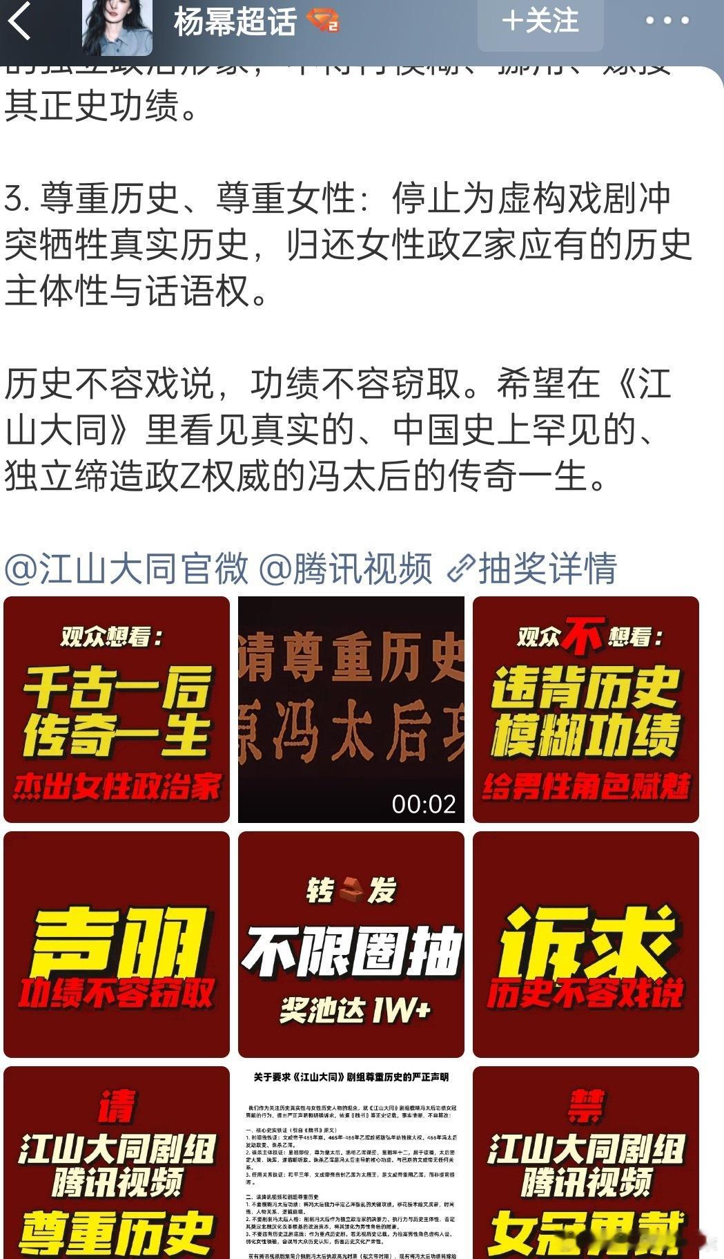 杨幂粉丝抽奖大字报维权《江山大同》 。我现在完全相信老登们只是用杨幂做幌子,实际唯爱男宝,一群老登打心底里都不服拍冯太后这个女政治家,所以才会把功绩戴给男人。