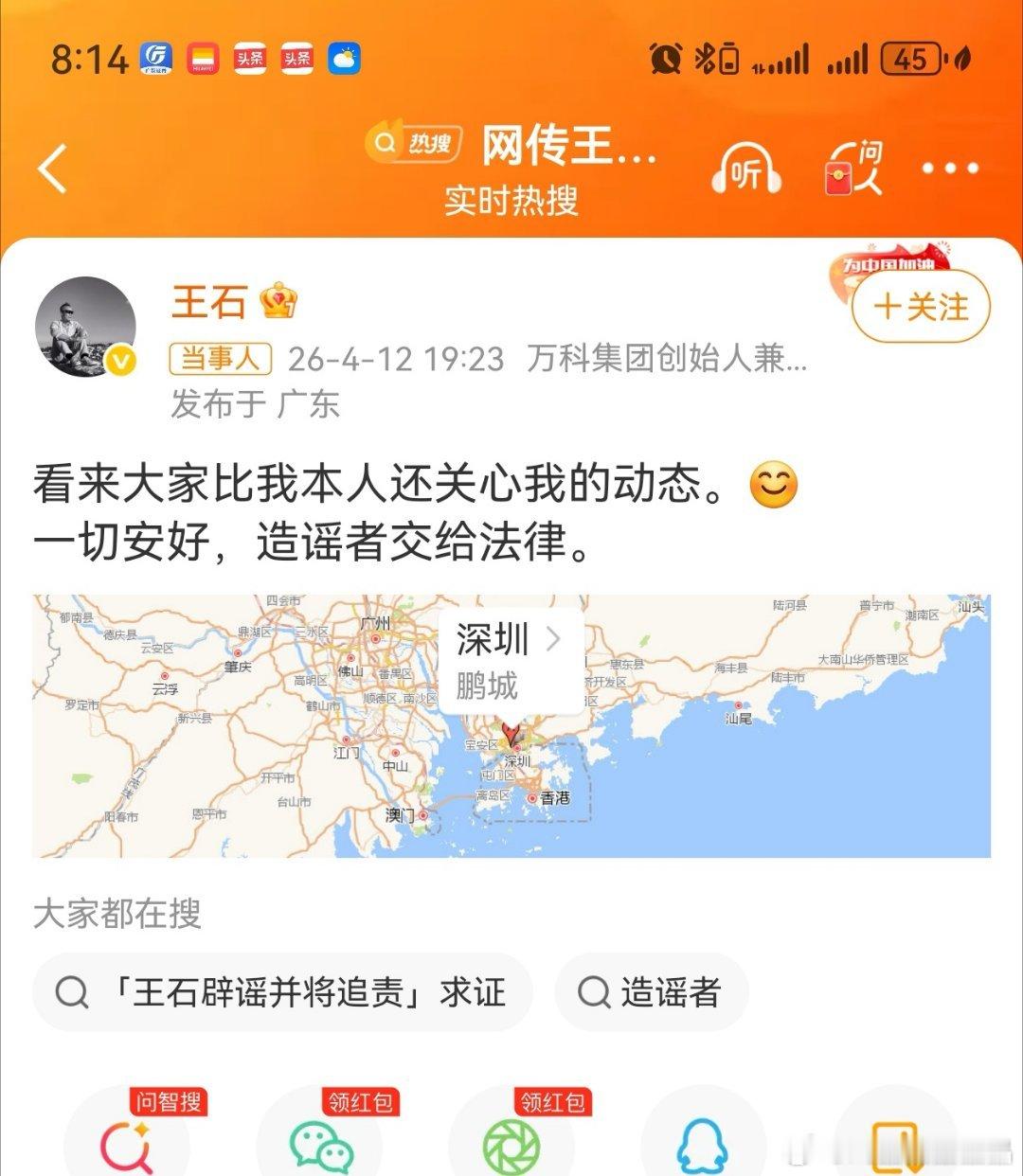 王石否认被抓王石和老婆田朴珺一起辟谣,王石还特地晒了一下ip在深圳。