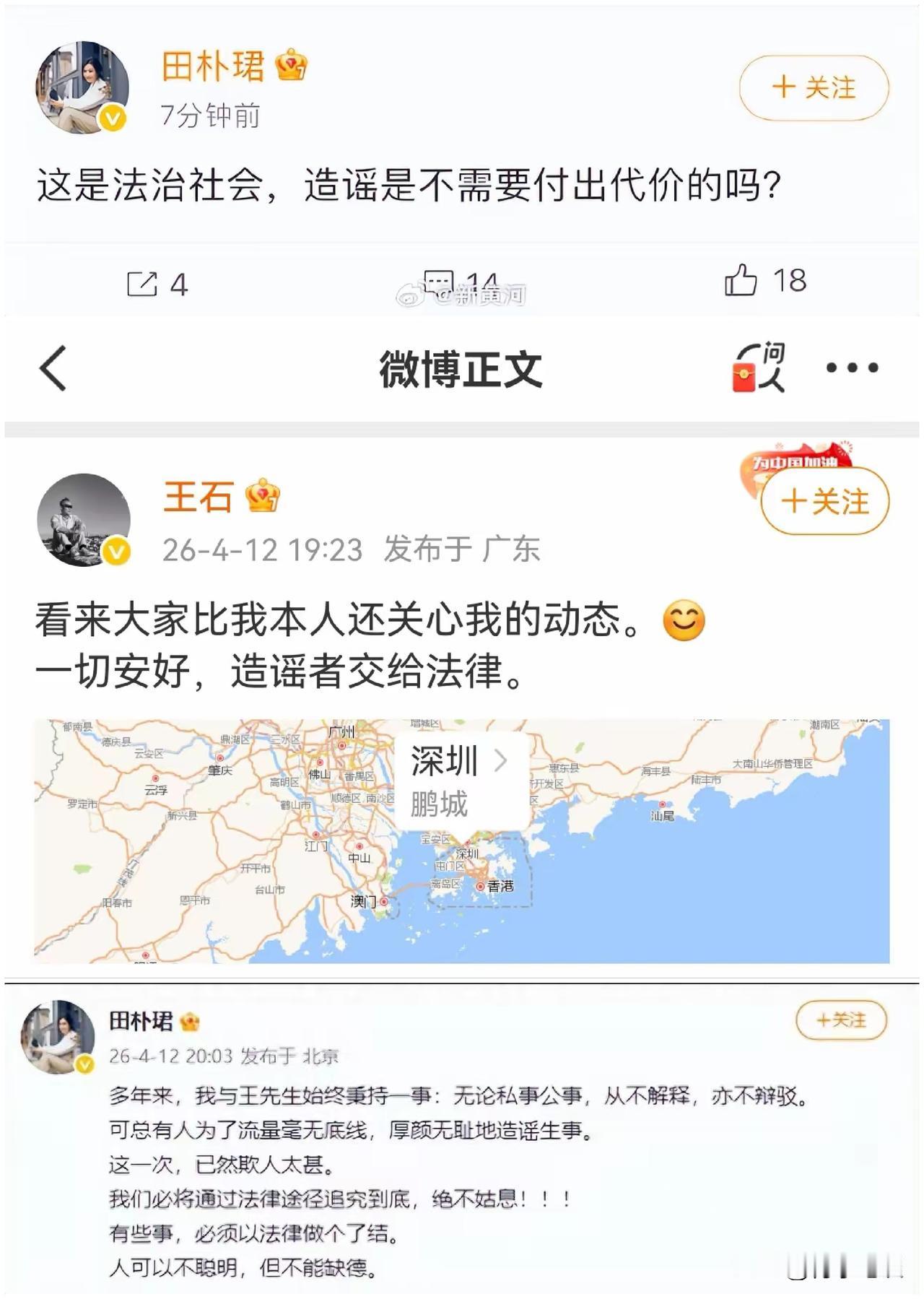 这些消息连续发布后,王石夫妇也连续在社交媒体辟谣,田朴珺更是强调要诉诸法律,认为对方是为了流量,这一次绝不姑息!