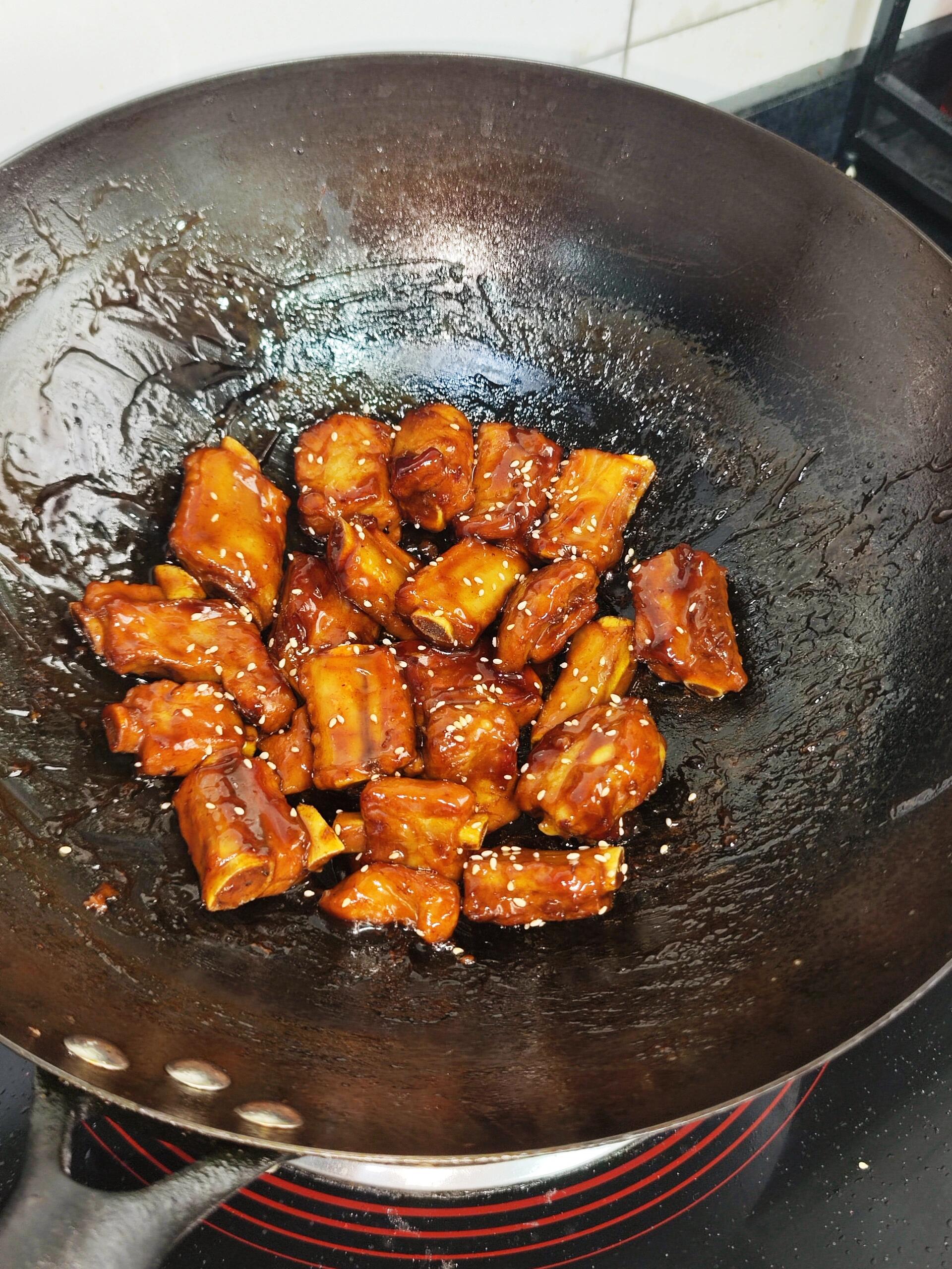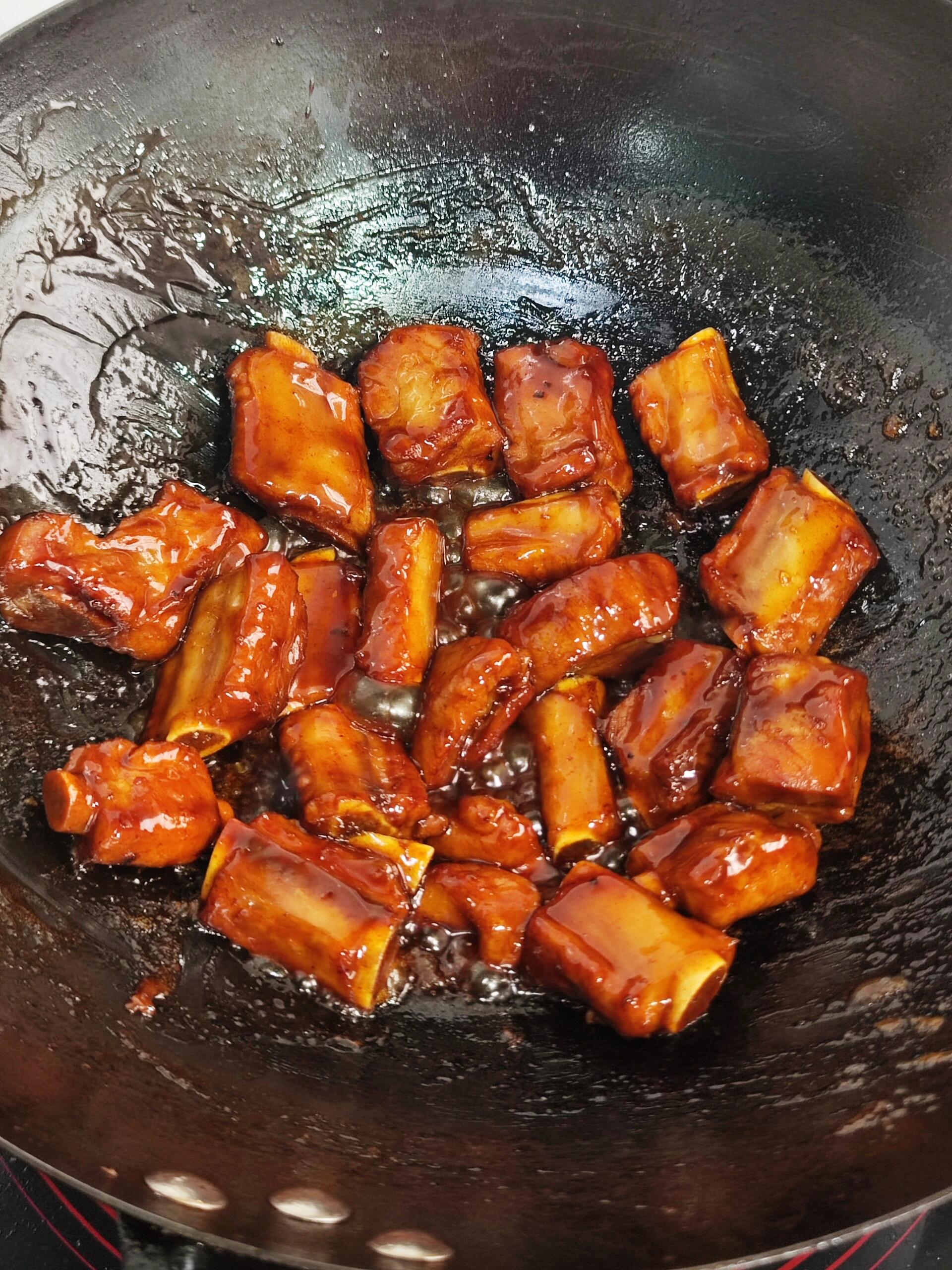 重点提醒:火候千万不能大,否则糖会炒糊发苦,整锅排骨就毁啦嗷!