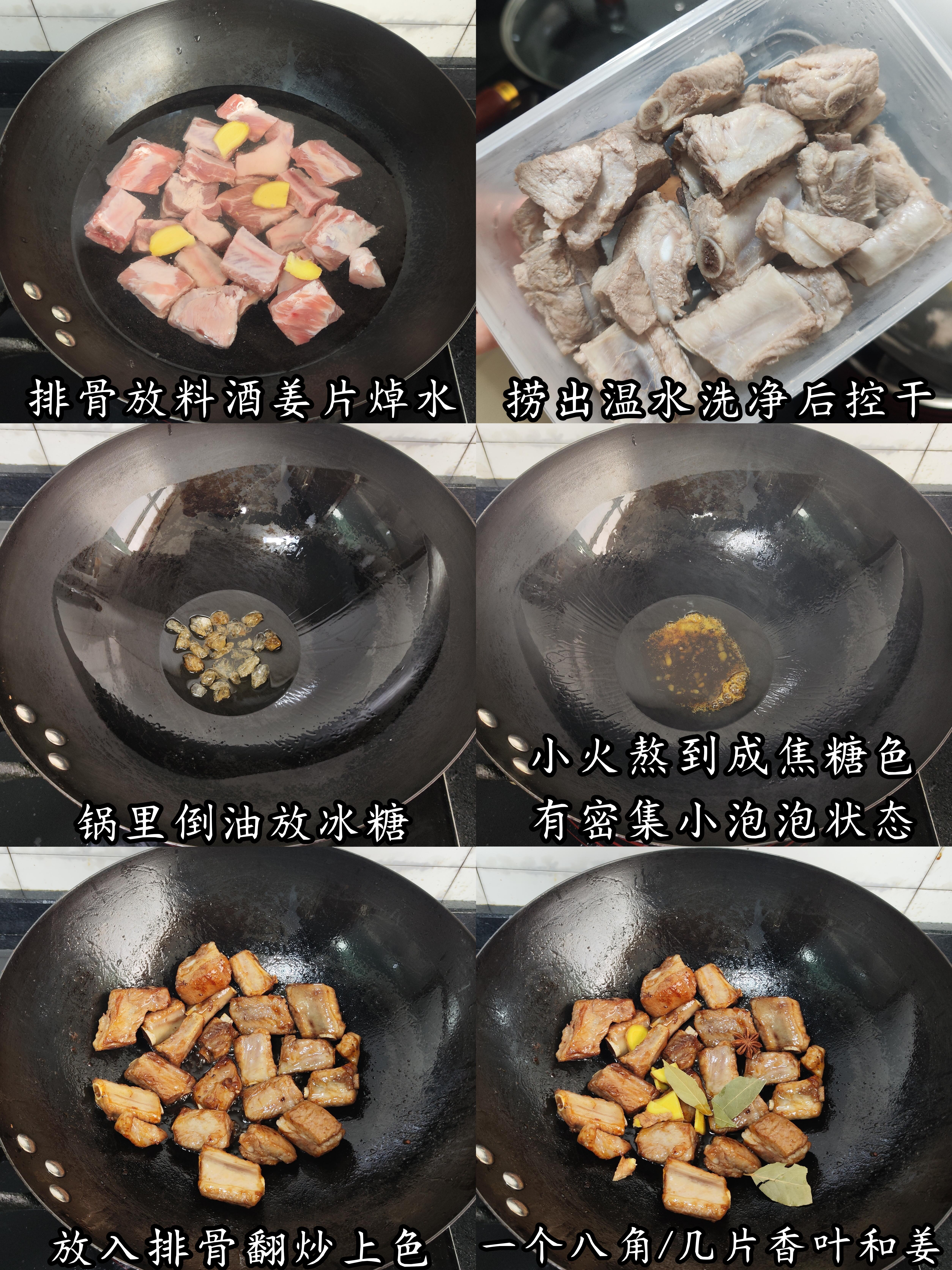 小贴士:排骨焯水用冷水,去腥更彻底;炒糖色全程小火,耐心搅动;炖排骨用热水,肉质更嫩不柴;收汁时勤翻动,避免糊底~