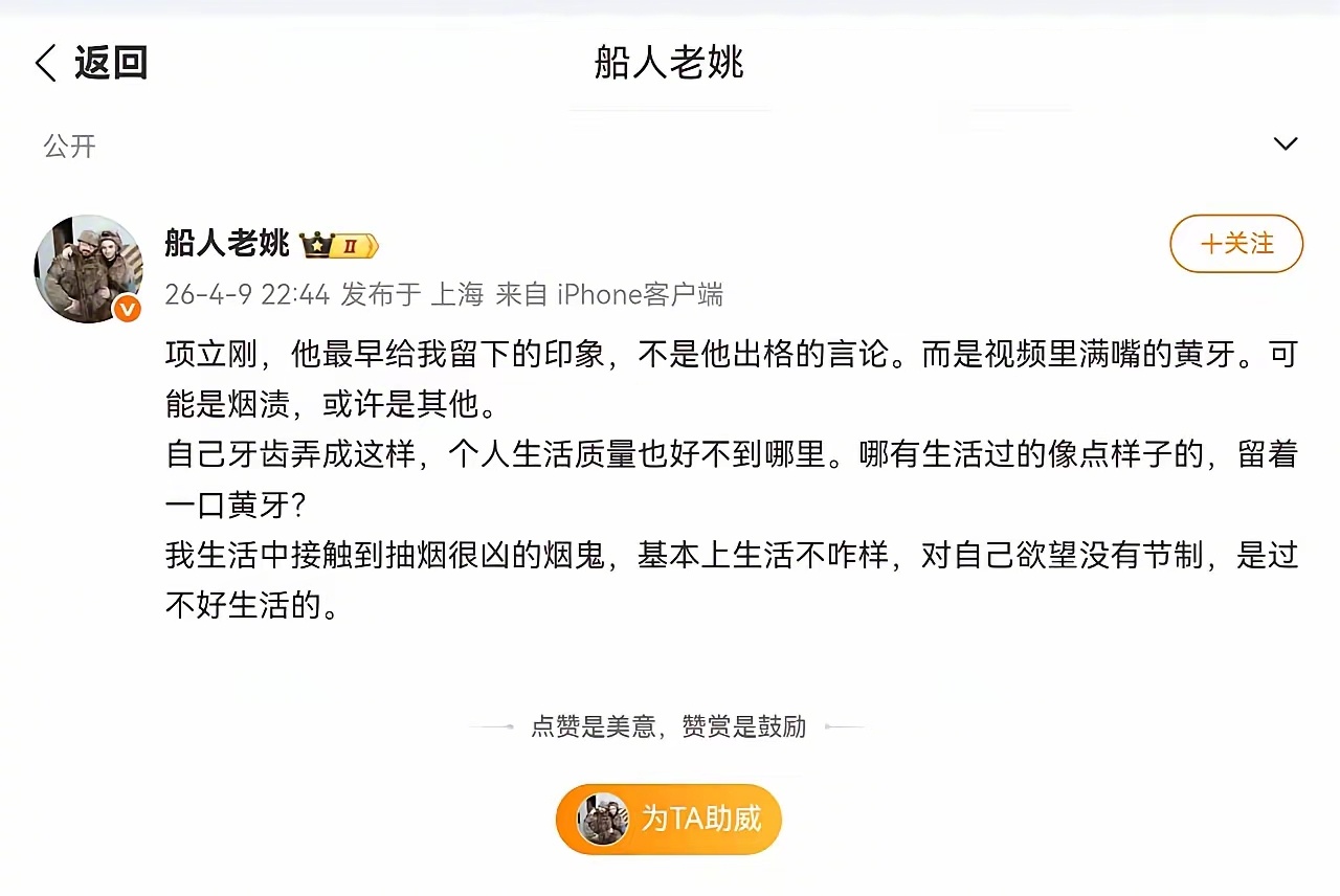 说项立刚满嘴黄牙是胡扯,项立刚从不抽烟。喝酒也很节制,生活非常自律。
