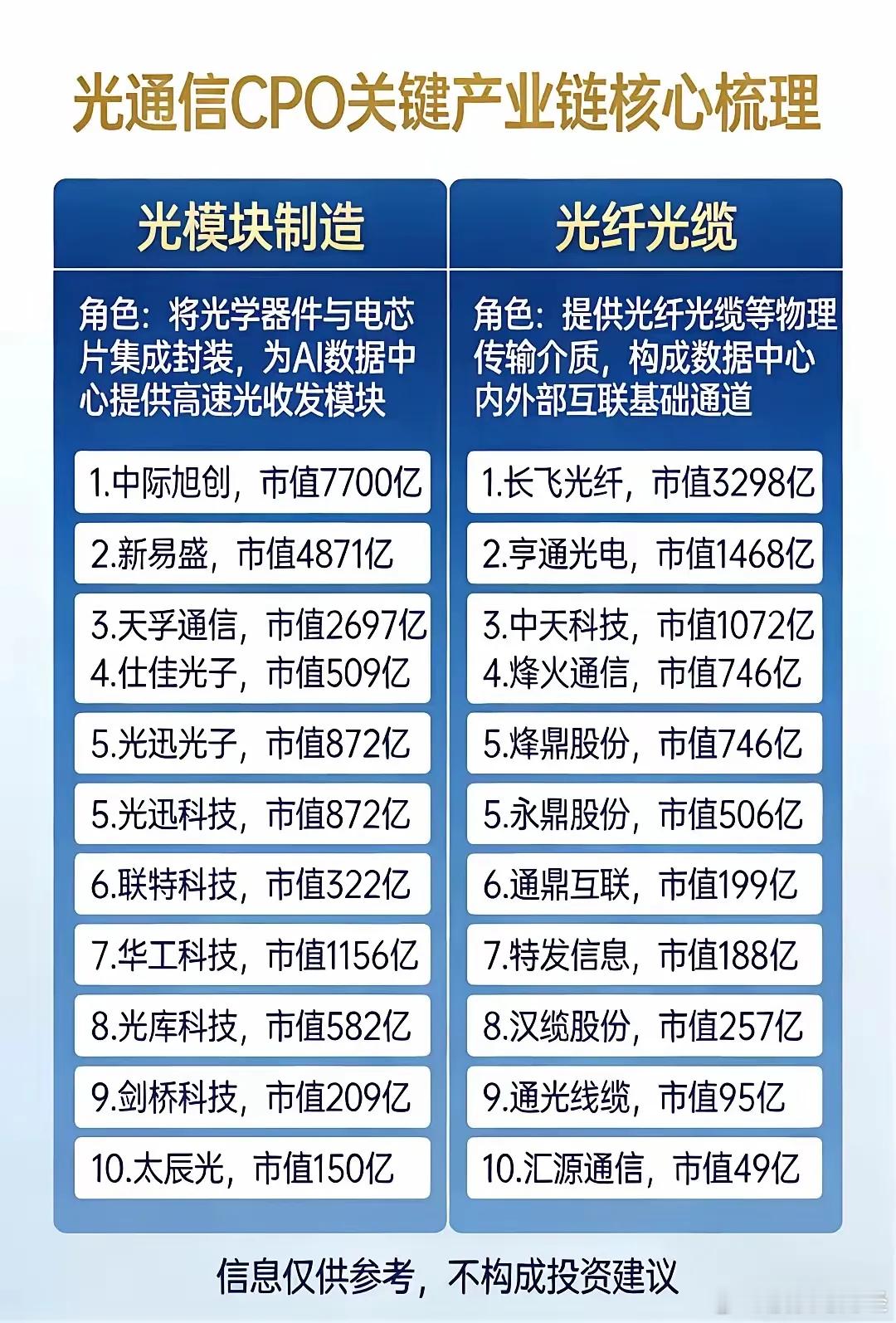 CPO封装光学全产业链龙头企业梳理!产业链主要分为上游光芯片/器件、中游光模块/封装、下游配套/系统集成三大部分。以下是2026年最新全产业链龙头梳理(按环节):