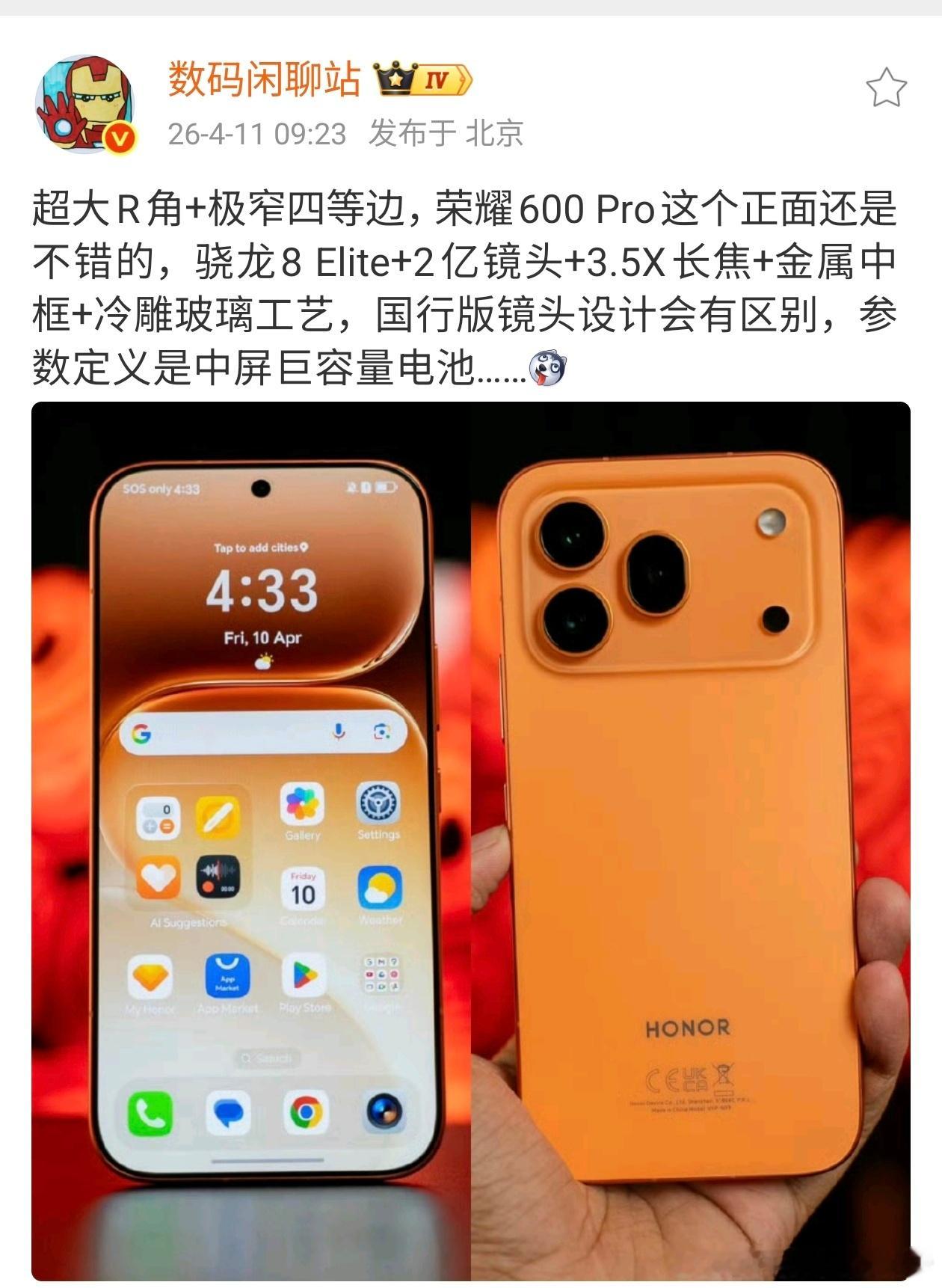 荣耀600 Pro海外版,好消息是正面大R角屏幕,极窄边框颜值极高;坏消息是,背面的设计和配色太像iPhone17 Pro系列了。配置倒是不错,据说国行版外观会有所不同,希望别是这个样子。