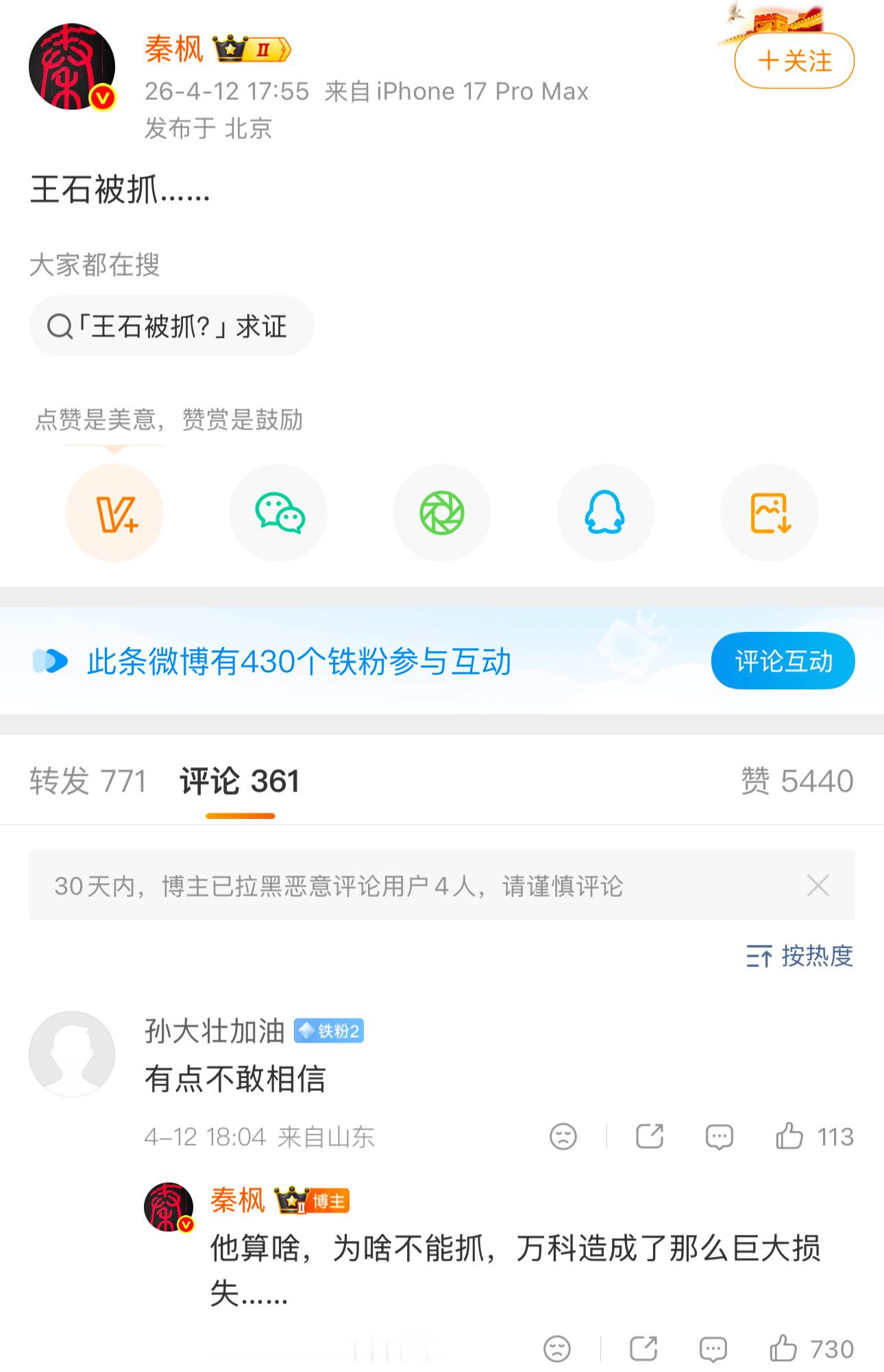 王石和田朴珺几乎同时发微博,算是推翻了秦枫关于王石被抓的传言……王石说了要交给法