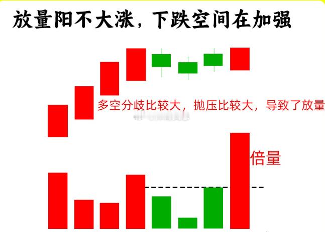 四、放量阳不大涨股价经过长时间的上涨以后,处于阶段的高位,成交量放量倍量,股价却没有多少涨幅,可能是小阳线,或是十字星,股价开始高位横盘,说明此时的市场分歧比较大,成交量大小,其实也代表分歧。说明此时有人在偷偷高位出货。这也是典型的量价背离